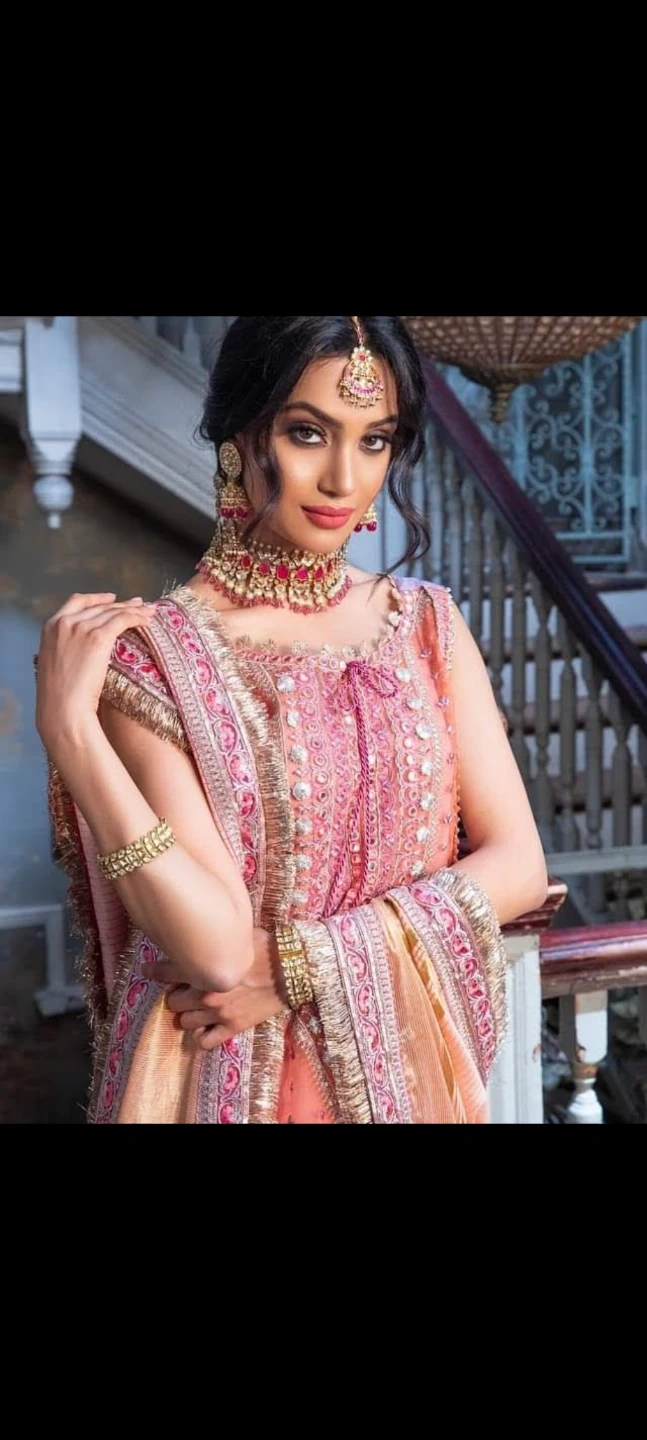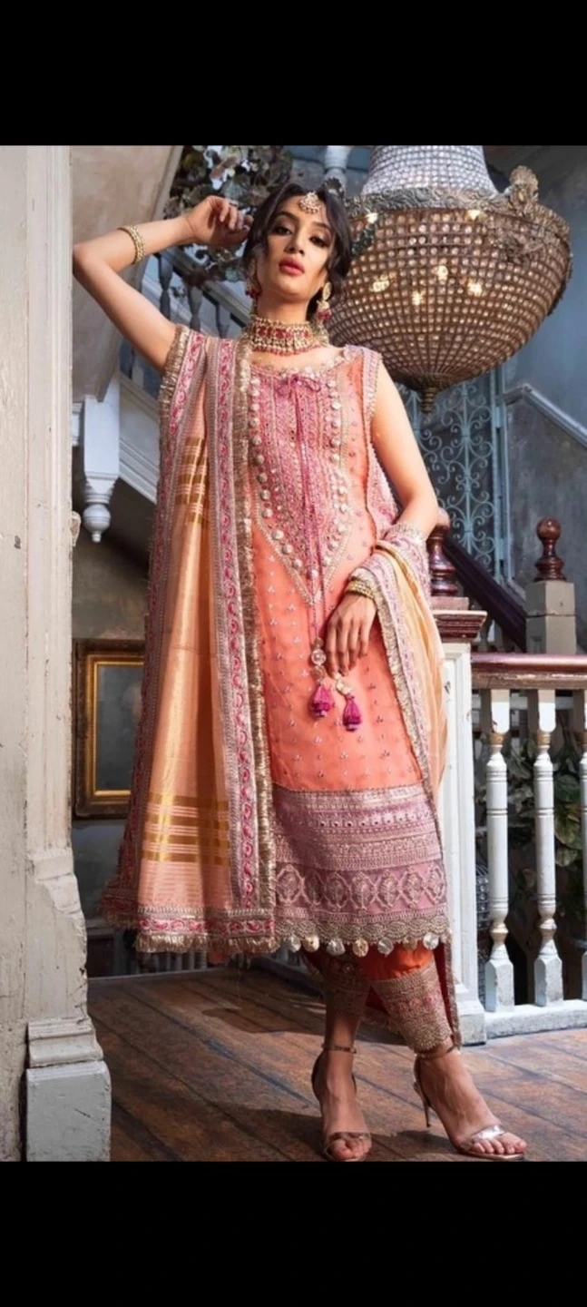 This traditional Pakistani suit features intricate embroidery and beadwork in shades of pink and peach. It includes a kameez, matching trousers, and a dupatta. Perfect for festive occasions or formal events!