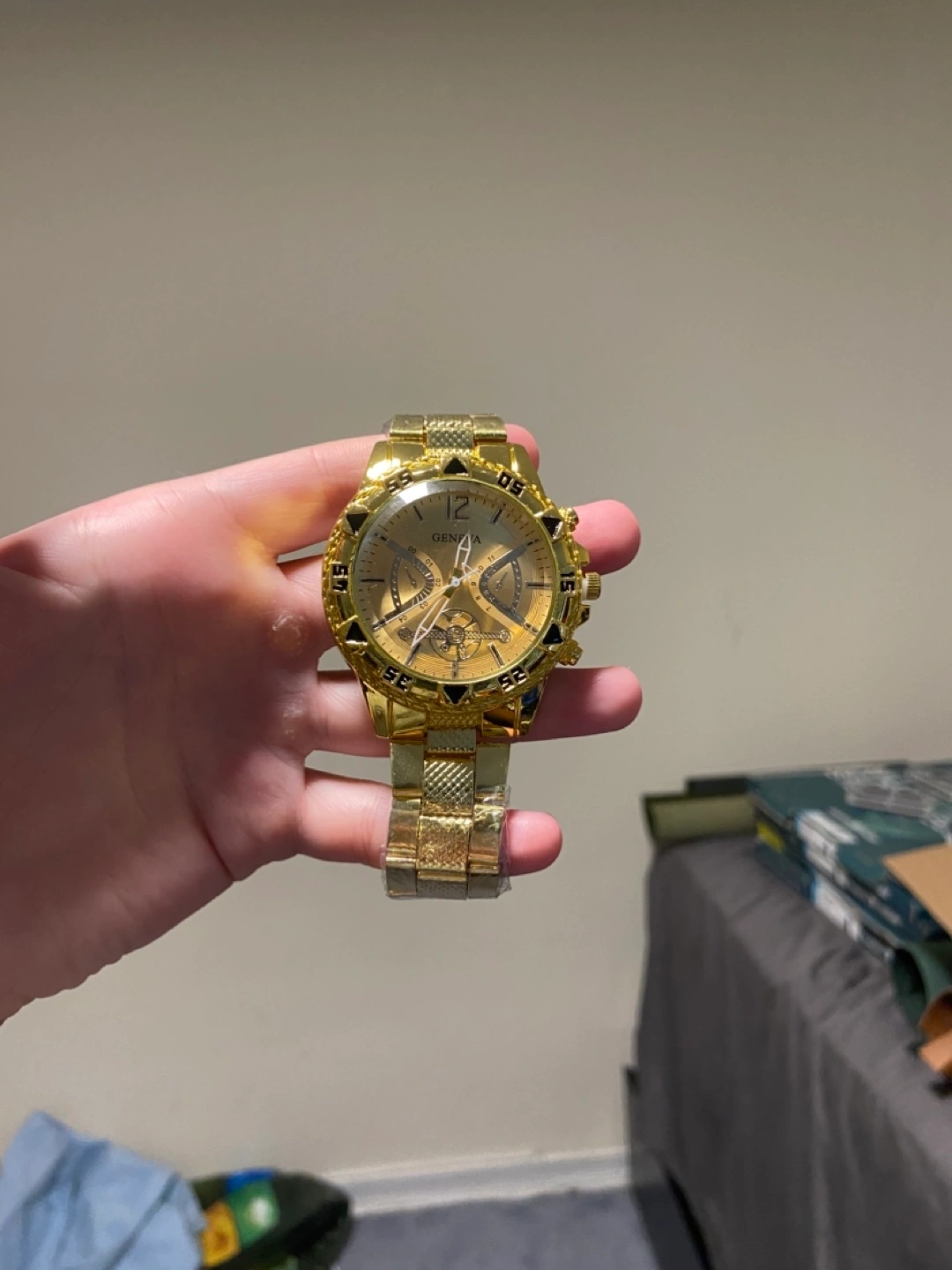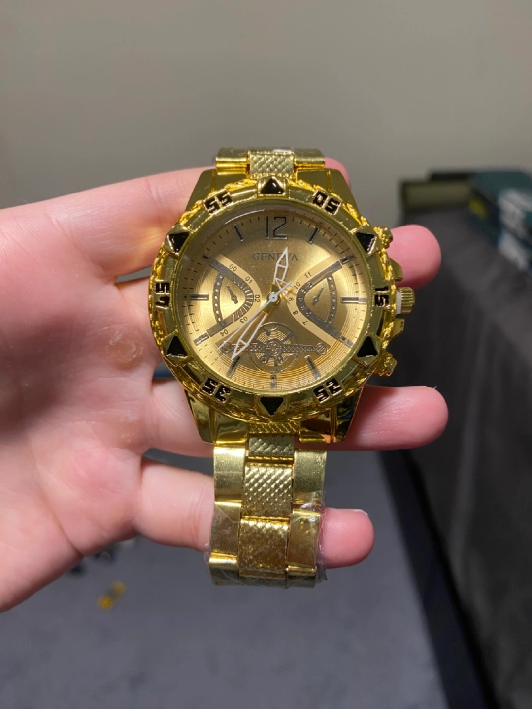 Selling a gold-tone Geneva wristwatch. Never worn still in packaging. It has a unique design and is in great condition. Perfect for adding a touch of class to any outfit!