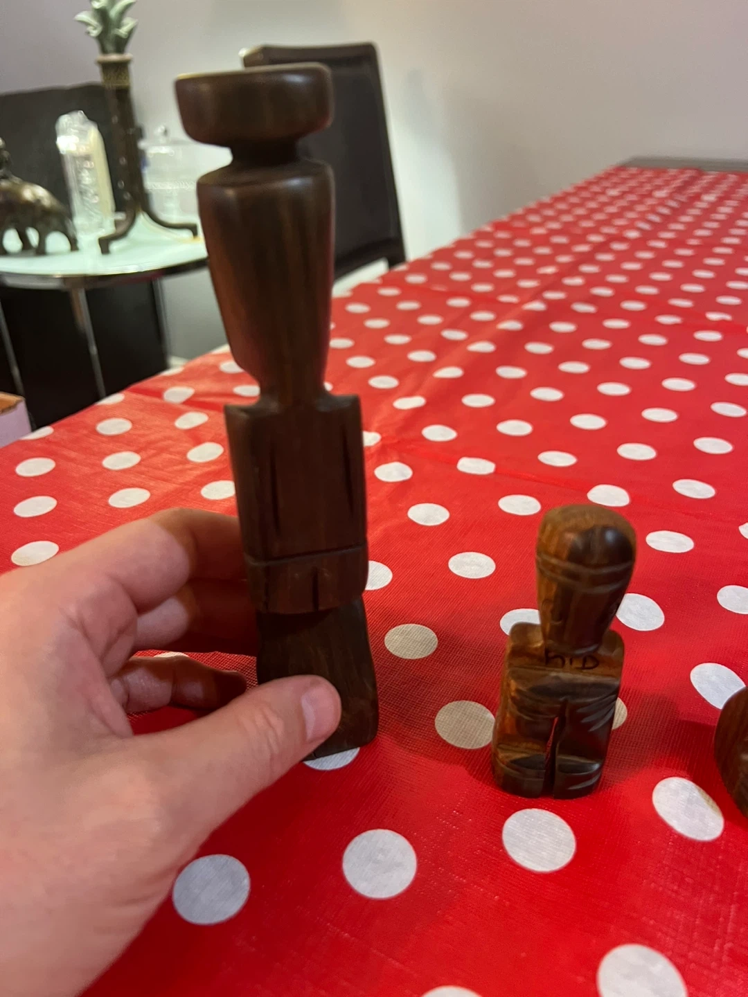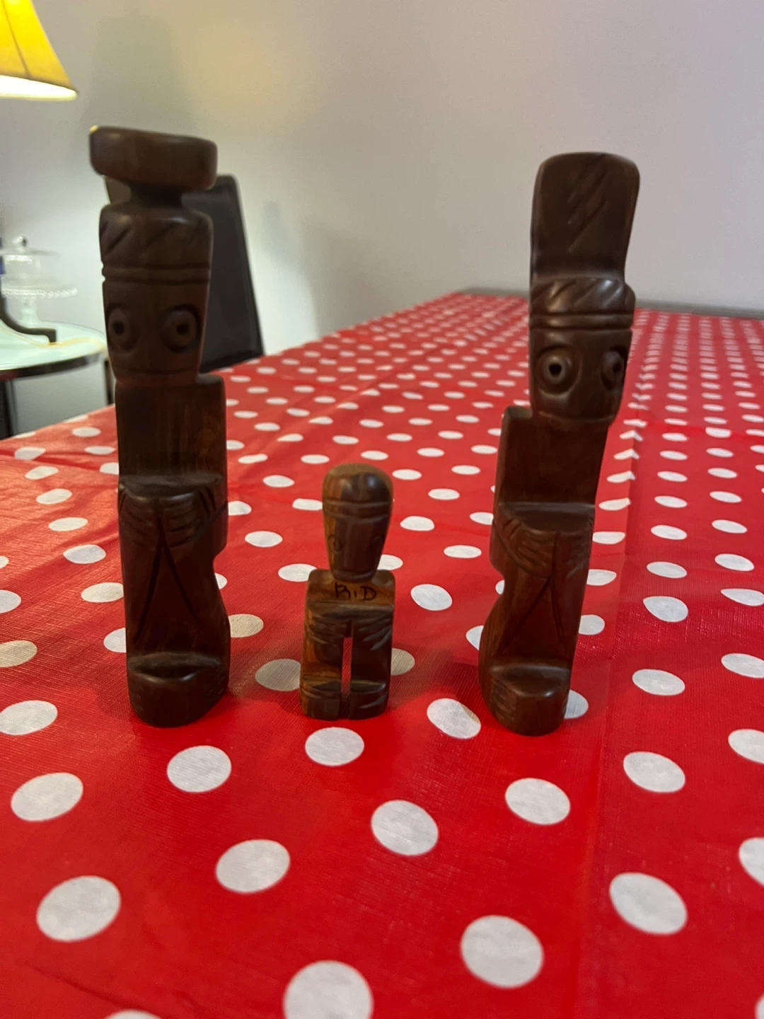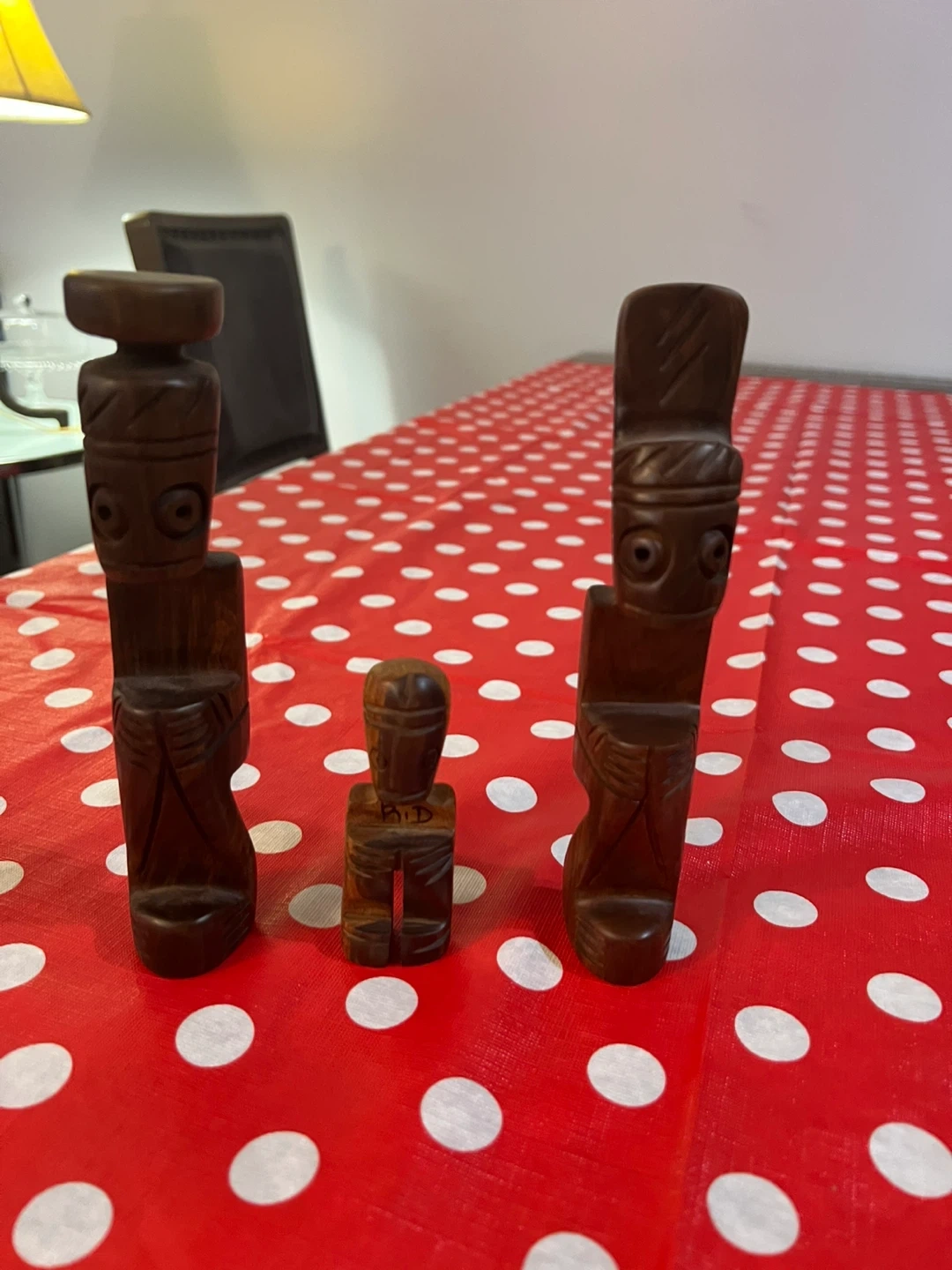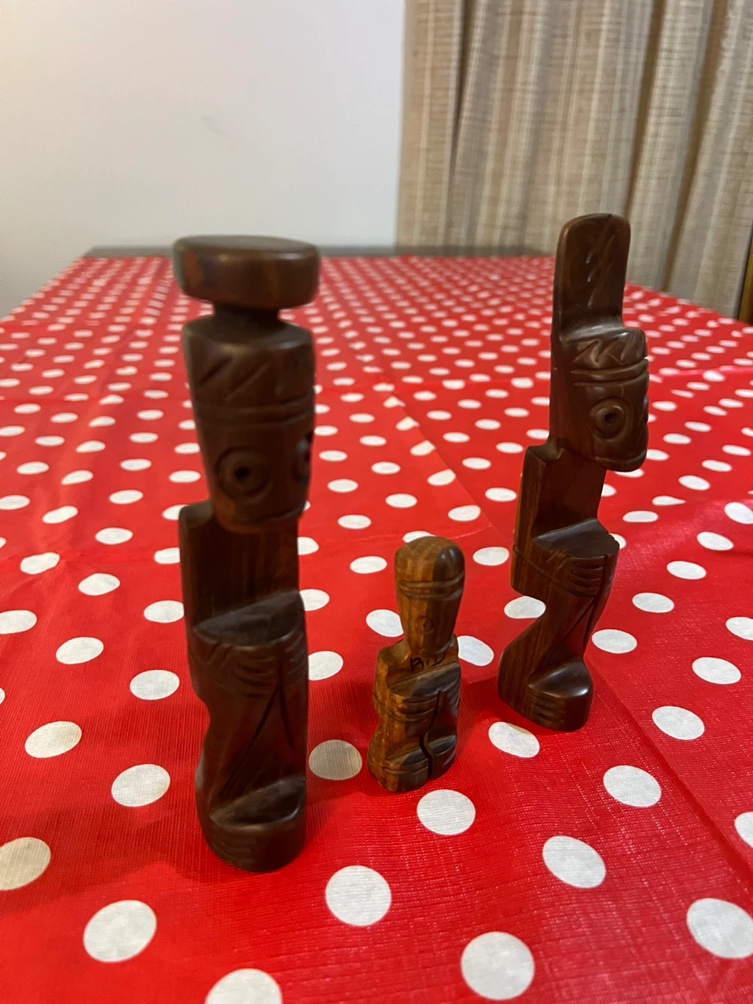 Three unique wooden figurines, hand-carved with intricate details. The largest figure stands tall, while two smaller ones complement it. Made from dark wood.