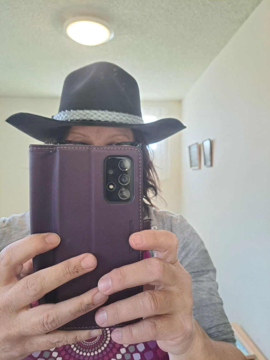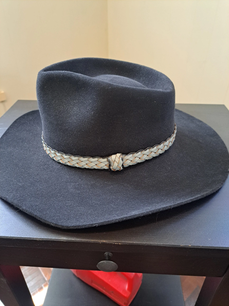A stylish Australian black fur cowboy hat. Has a leather strap around the hat. A great item for sun protection, adding a touch of style and comfort.