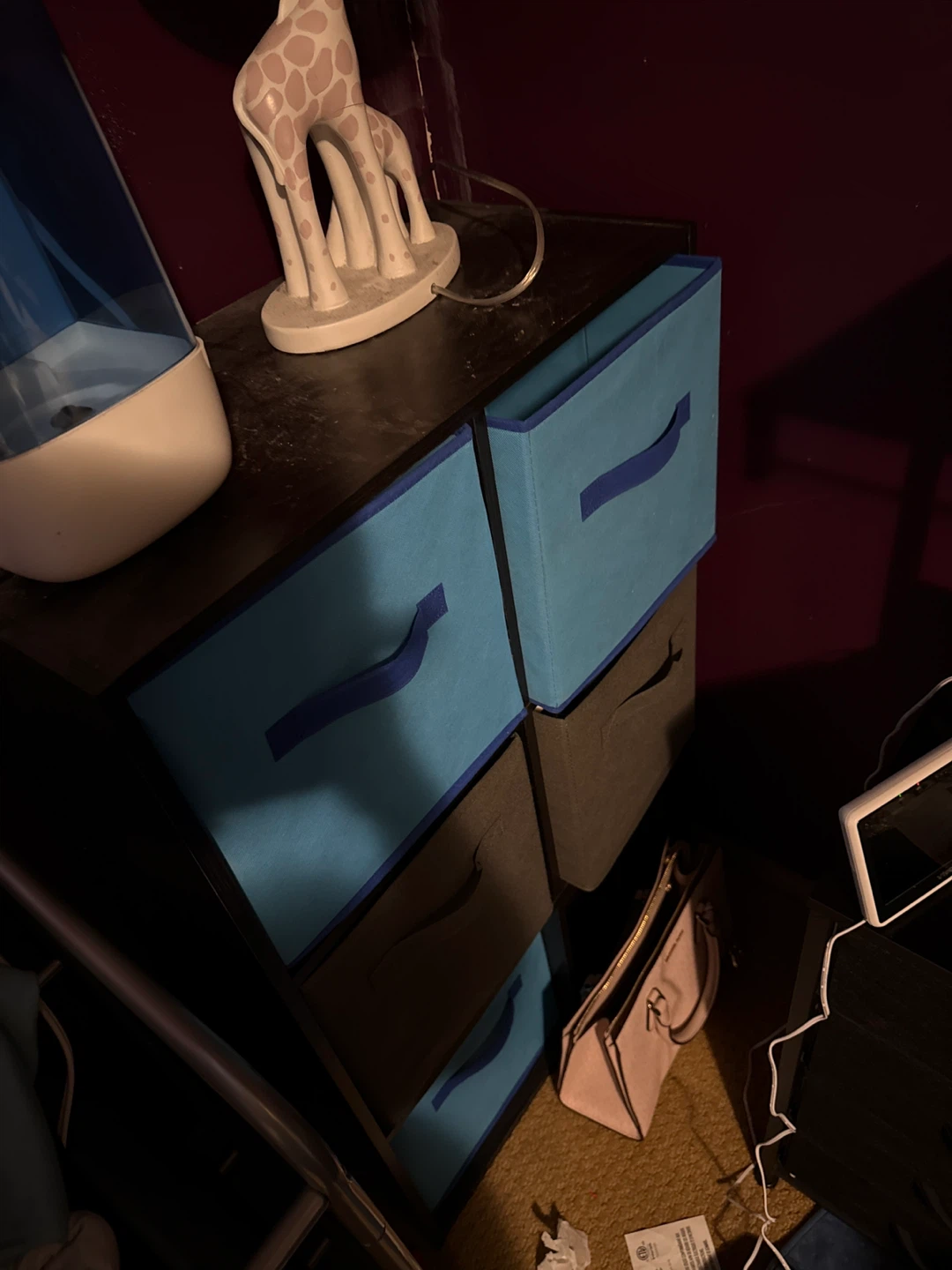 Set of fabric storage drawers in blue and grey. These foldable bins have handles for easy access. Great for organizing toys, clothes, or linens.