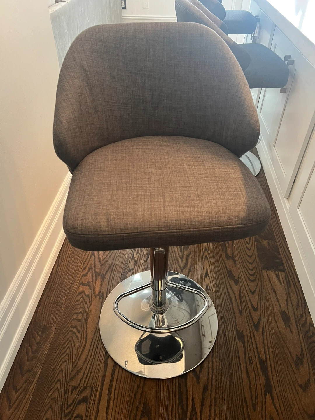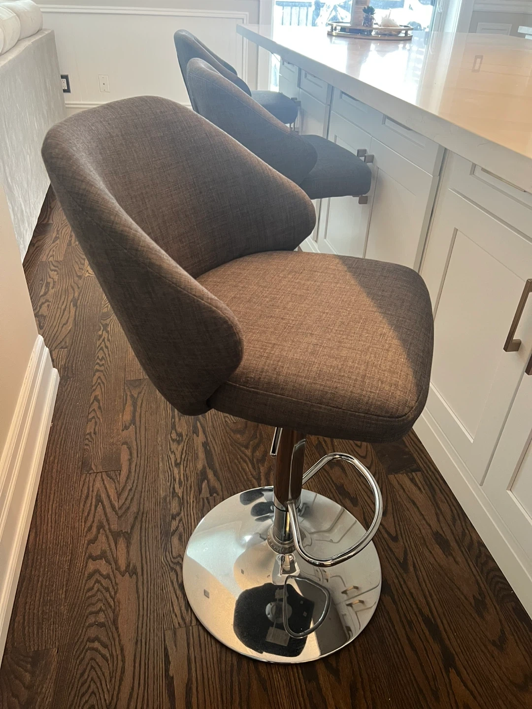 Selling 3 swivel bar stools with adjustable height. They have a comfortable seat and a sturdy chrome base. Perfect for your kitchen island or bar area! I purchased 6 from Hudson Bay for $189 each. Great quality!