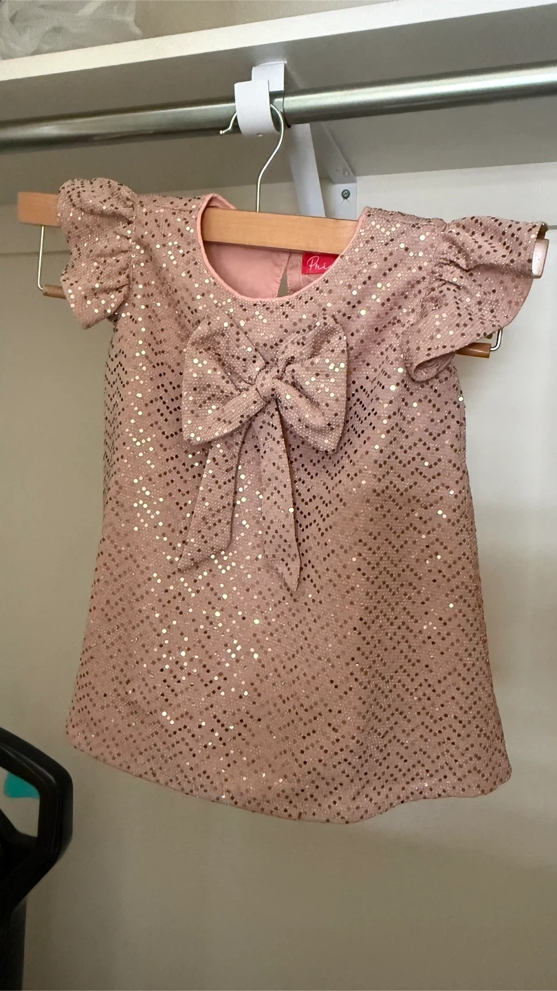 Sparkly rose gold sequin dress with a large bow accent on the front. It has ruffled short sleeves and a soft pink lining. Perfect for special occasions!