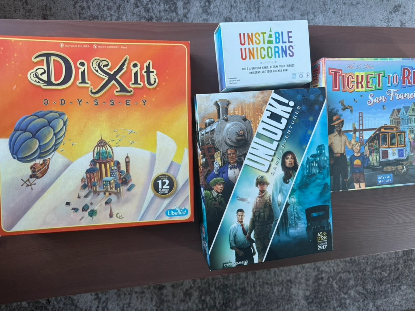Buy & SellBoard gamesBoard games$20Selling bundle of these four games for 20 dollars: - Dixit - Ticket to ride - Unstable Unicorns - Unlock In very good conditionsWHERE TO MEETParkView MapSELLERLauraOssington181 review3 chats·2 favorites·27 viewsSEND CHAT TO SELLERHi Laura! I’m interested in your listing.Hi Laura! I’m interested in your listing.Get the Karrot app to chatSign In to chat