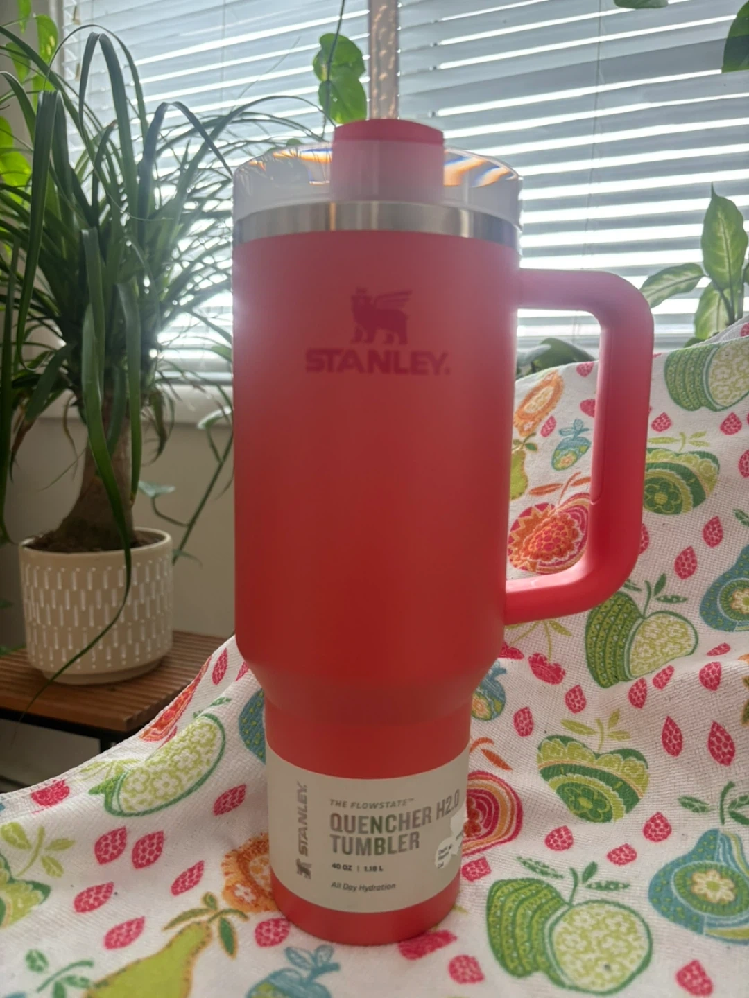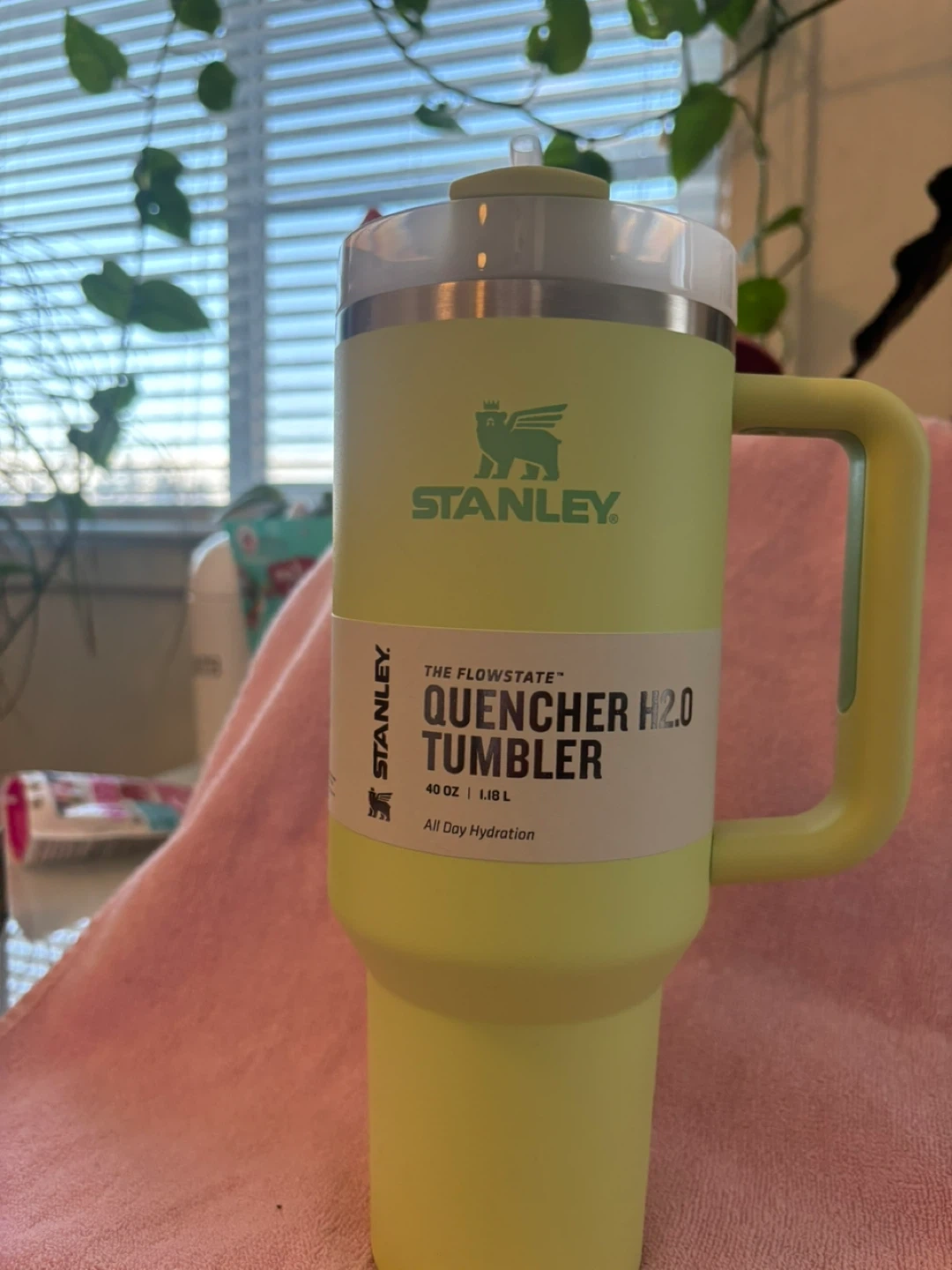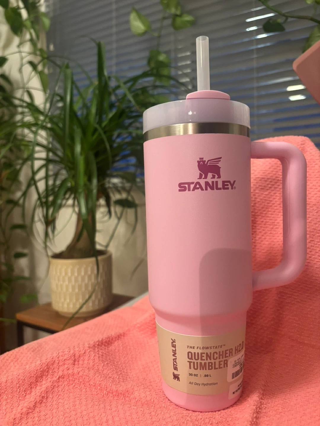 Fuzzy Easter key chain This is a 30 oz Stanley Flowstate Quencher H2.0 Tumbler in a pale pink colour. It's designed for all-day hydration. Keeps drinks cold for hours!