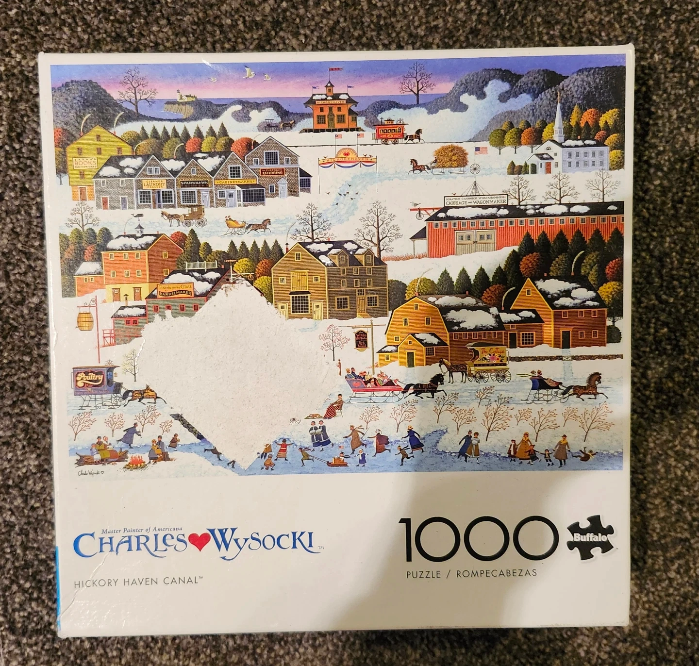 This Buffalo Games puzzle features 'Hickory Haven Canal' artwork by Charles Wysocki. It's 1000 pieces and includes a puzzle diagram. The puzzle is made with FSC certified paper and 100% recycled paperboard.