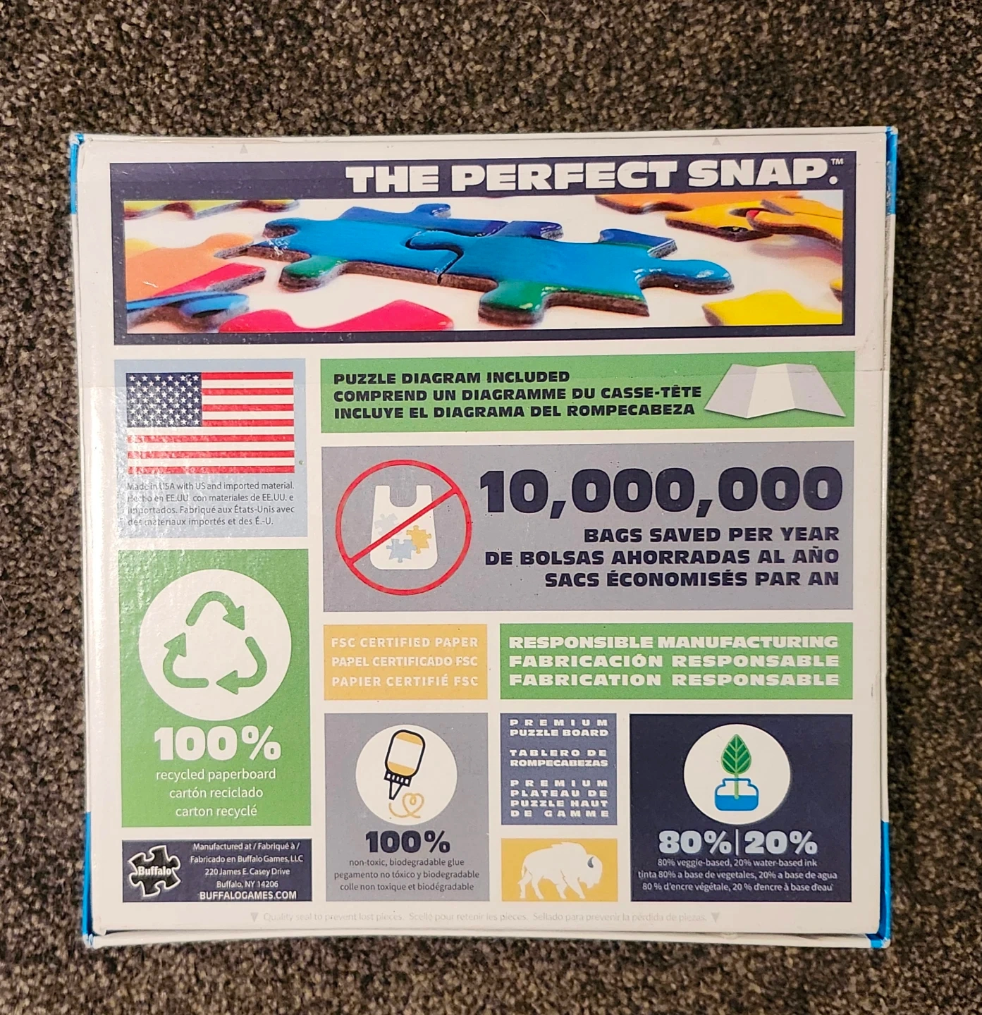 This Buffalo Games puzzle features 'Hickory Haven Canal' artwork by Charles Wysocki. It's 1000 pieces and includes a puzzle diagram. The puzzle is made with FSC certified paper and 100% recycled paperboard.