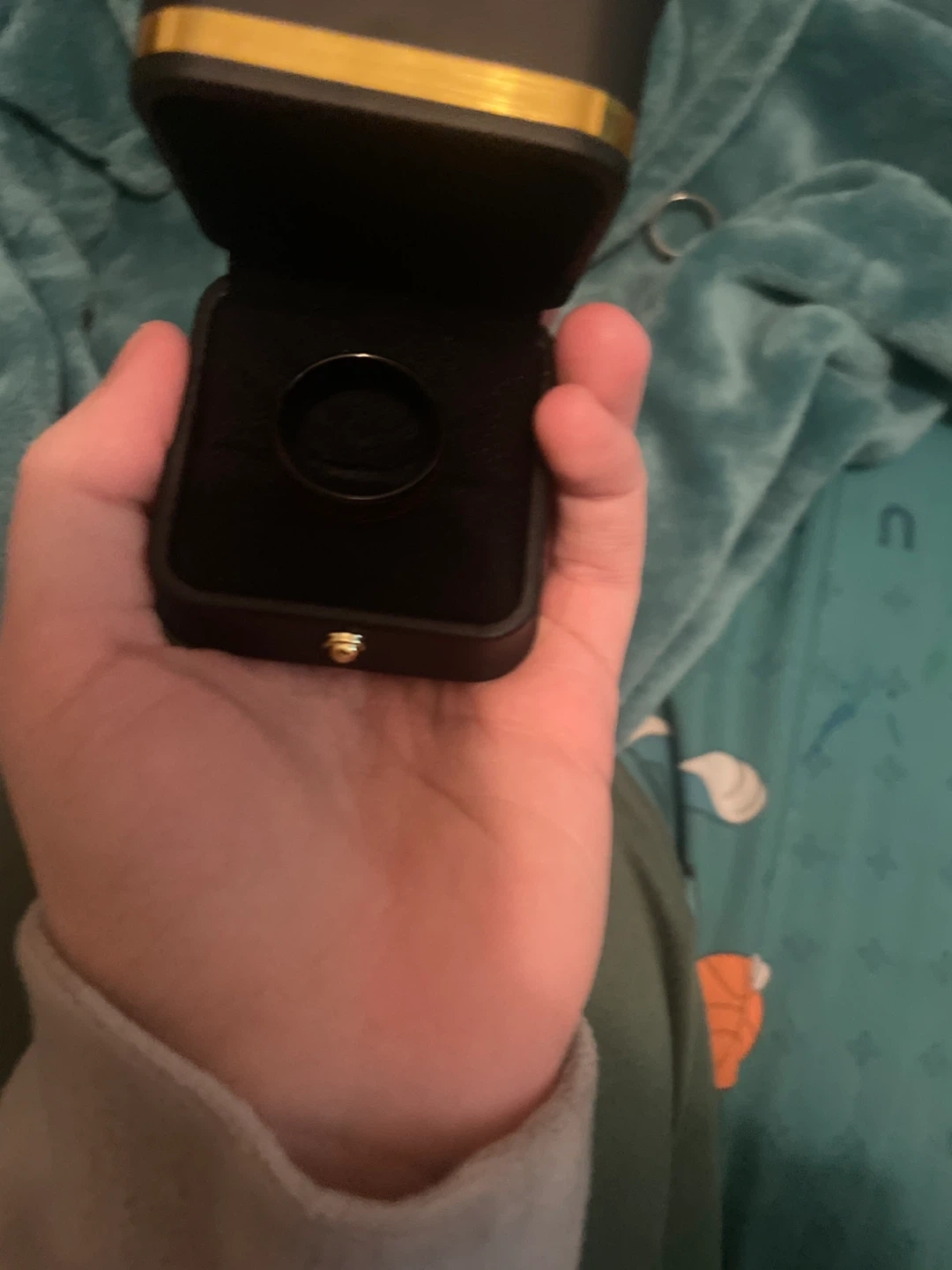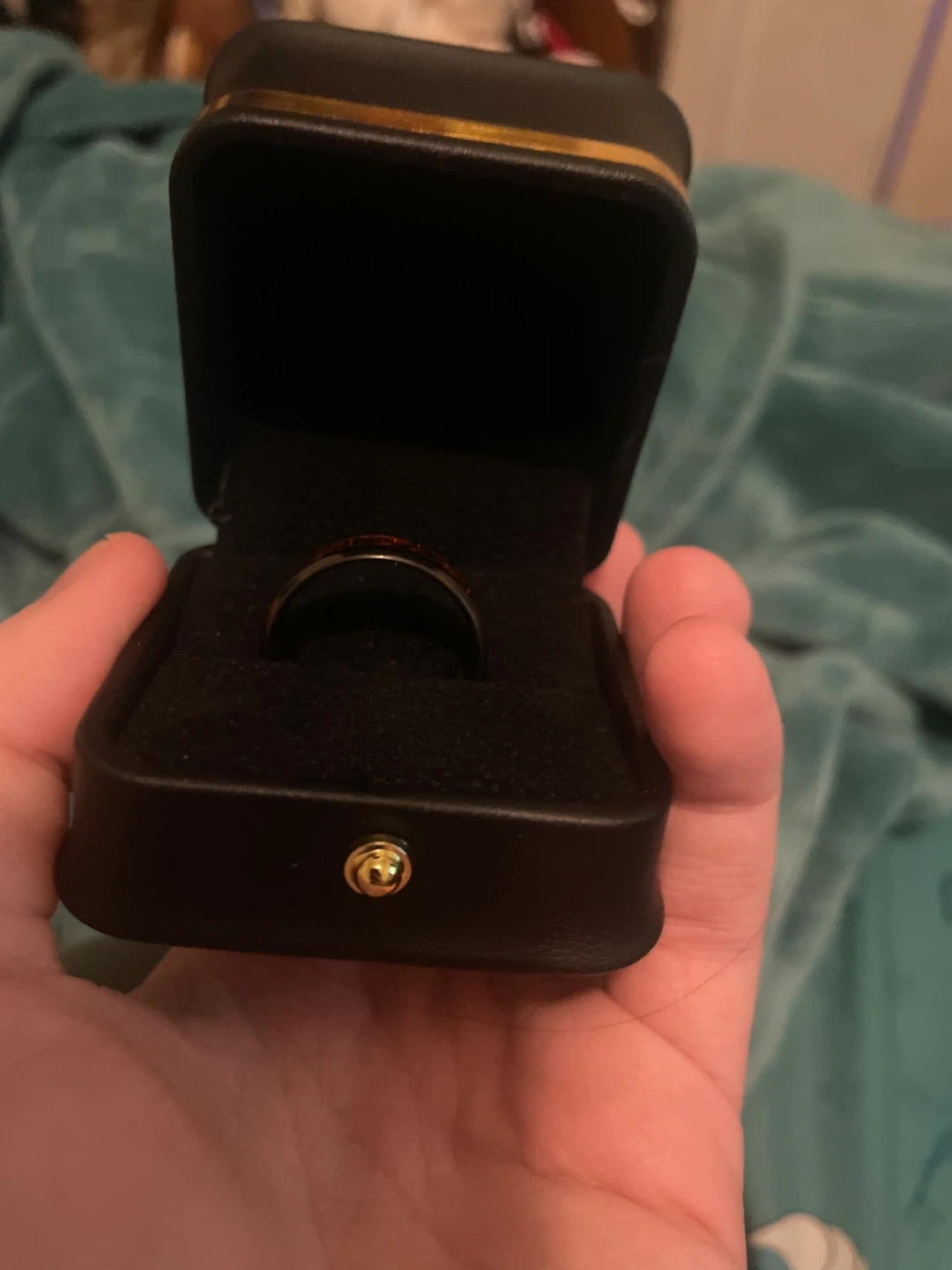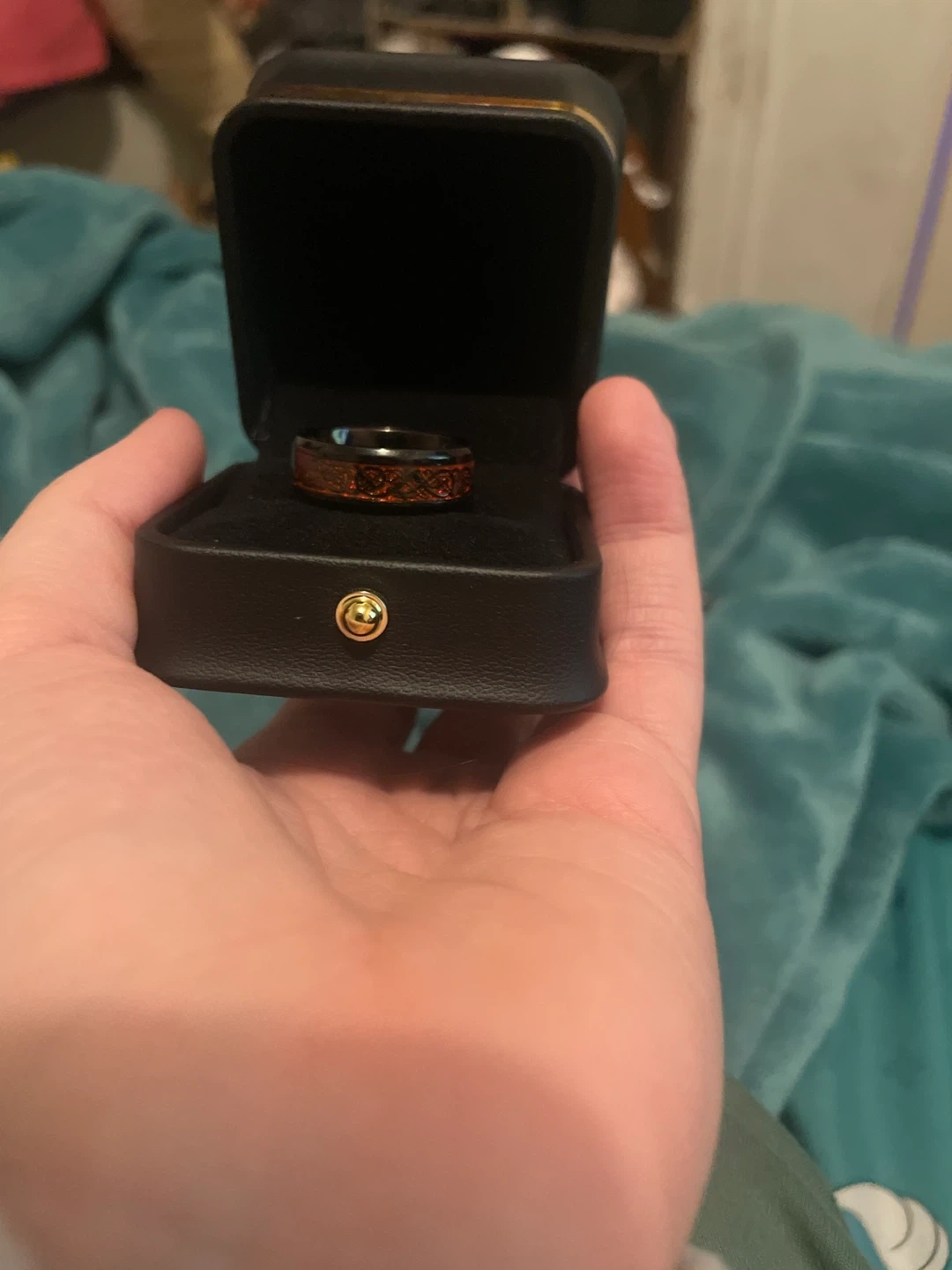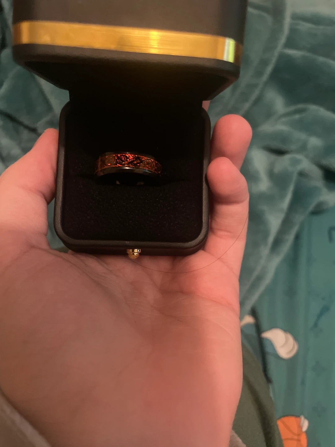 This tungsten ring features a cool red glitter and black inlay design. The band itself appears to be black tungsten with a reddish-orange inlay pattern. Ring box not included!!