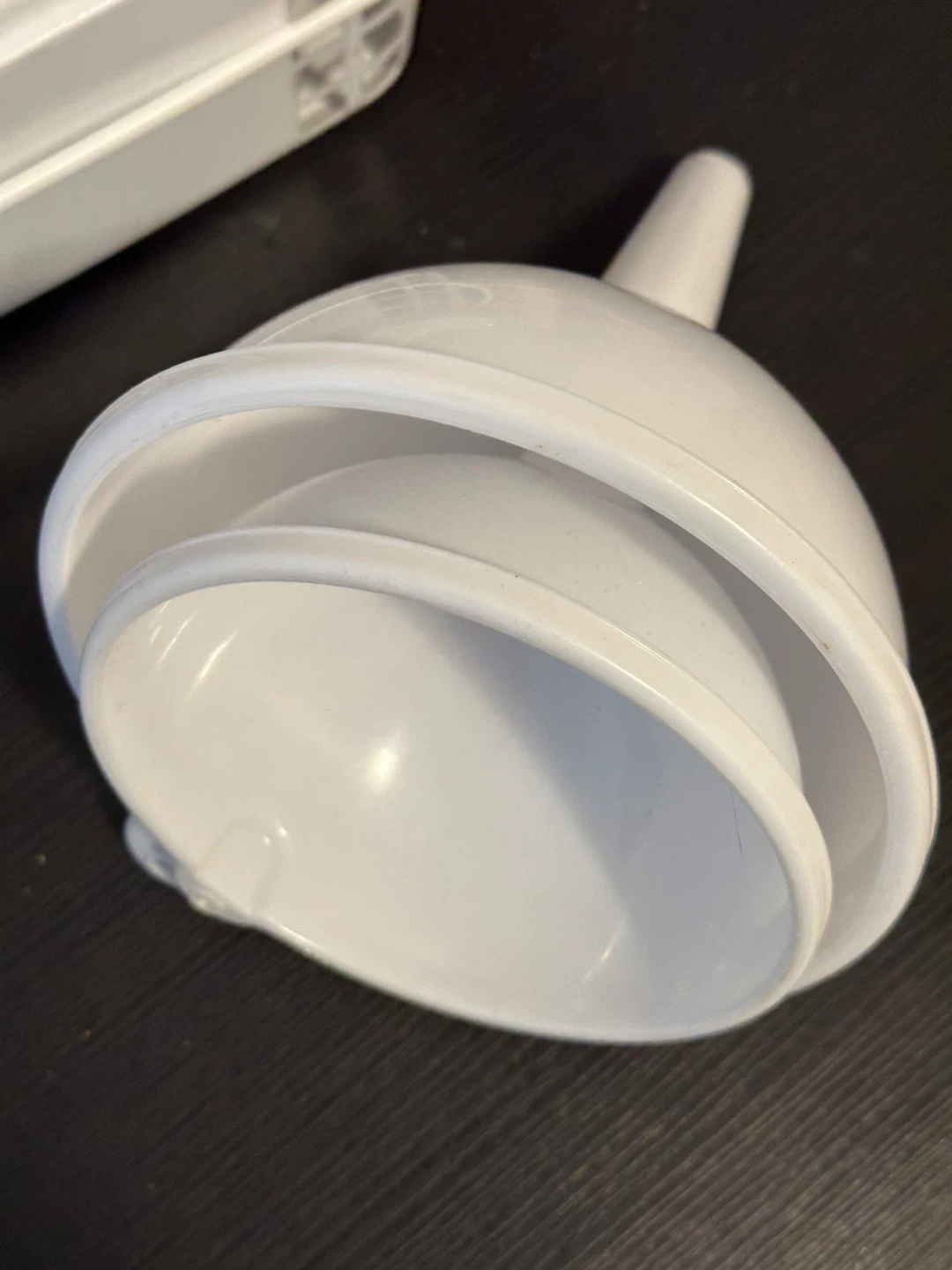 A set of two white plastic funnels for transferring liquids. They're nesting for easy storage. Great for kitchens and garages!