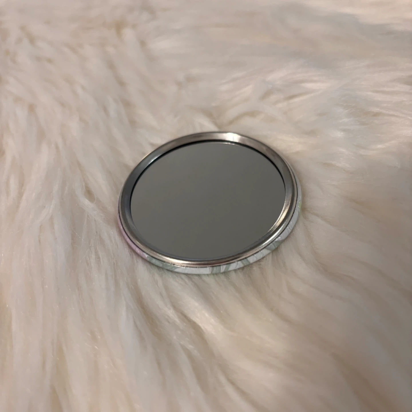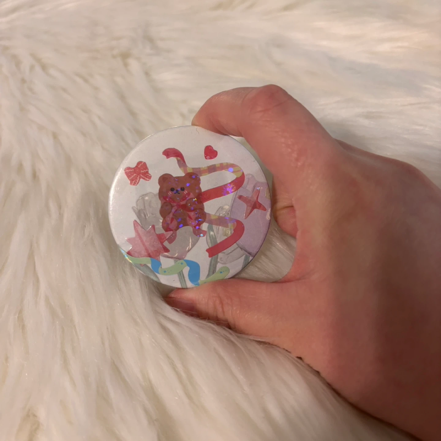 A small, round pocket mirror with a cute design featuring a teddy bear, ribbons, and hearts. It's perfect for quick touch-ups on the go. The mirror is made with a metallic casing and a reflective glass surface.