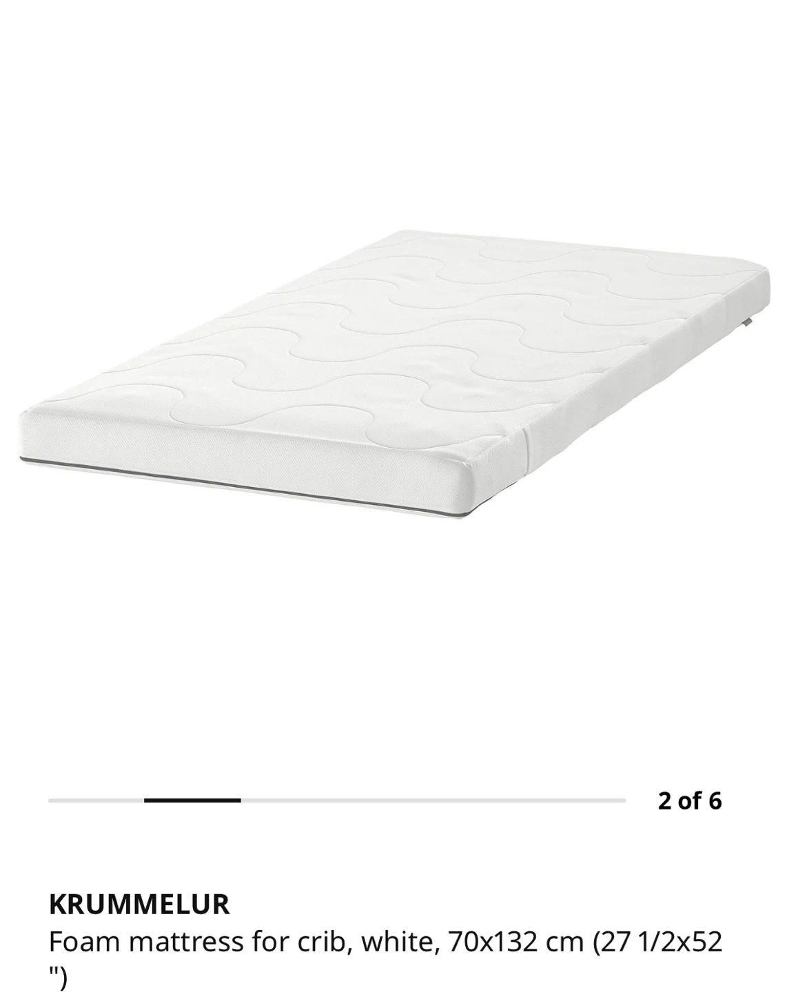 This is an IKEA KRUMMELUR foam mattress for cribs. It's white and measures 70x132 cm (27 1/2x52"). The mattress is made of foam and has a quilted cover.