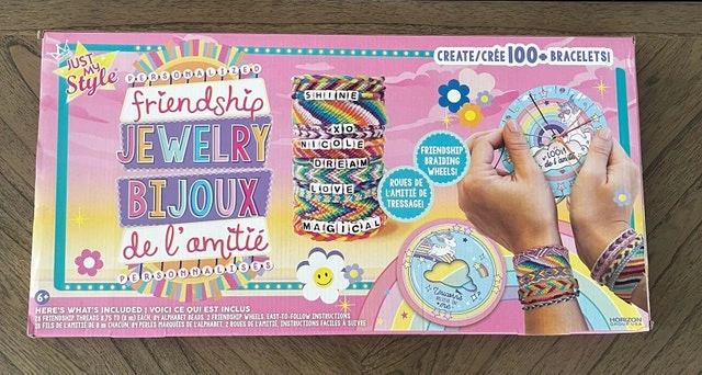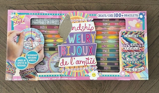 Get ready to create over 100 friendship bracelets with this Just My Style kit! It's new, complete with colourful threads and easy-to-follow instructions for hours of crafting fun. Unleash your creativity and make personalized gifts for all your friends! Includes friendship braiding wheels, beads, and charms. If this ad is still up, the bracelet kit is still available!