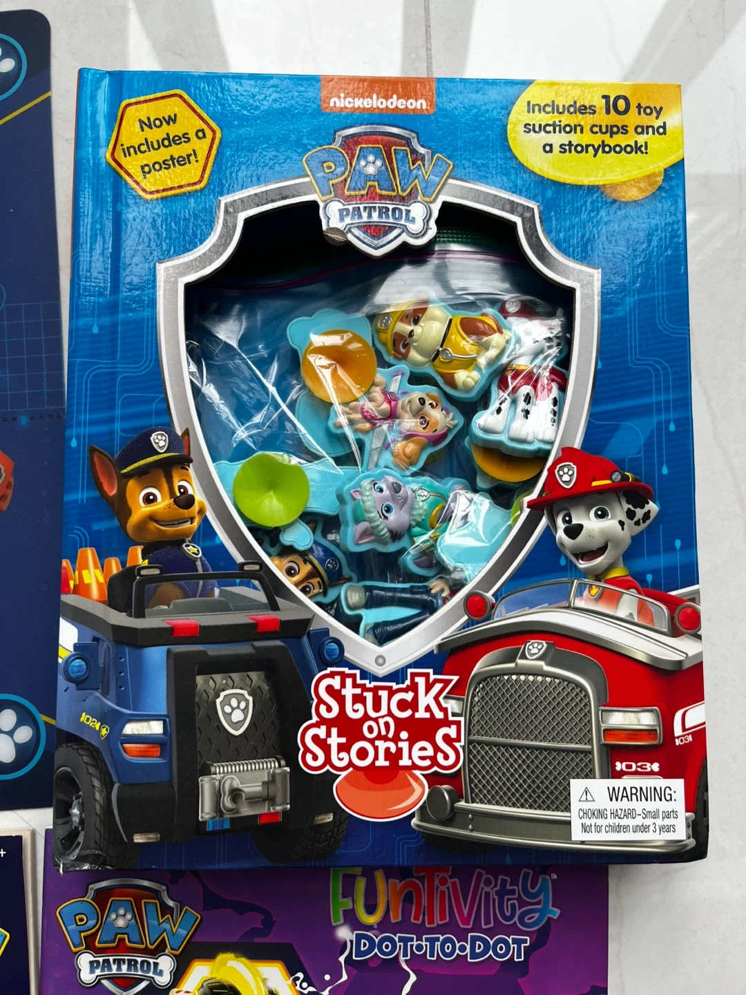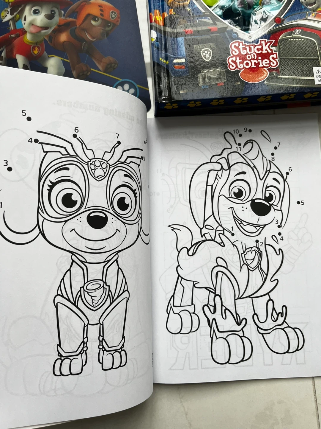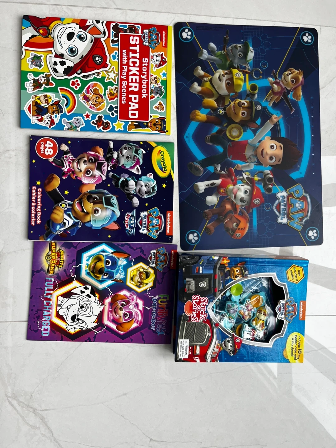 This set includes a Paw Patrol Storybook Sticker Pad with play scenes and a Crayola colouring book with 48 pages. It also comes with a Paw Patrol Stuck on Stories activity set featuring toy suction cups and a storybook. A Paw Patrol Funivity Dot-to-Dot book is also included.