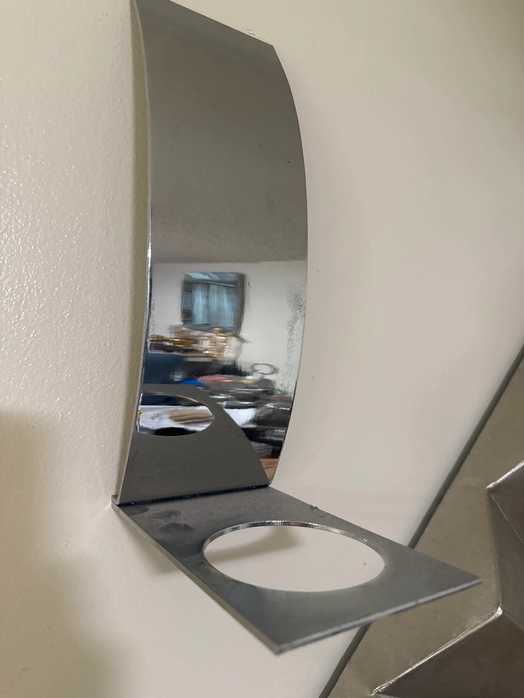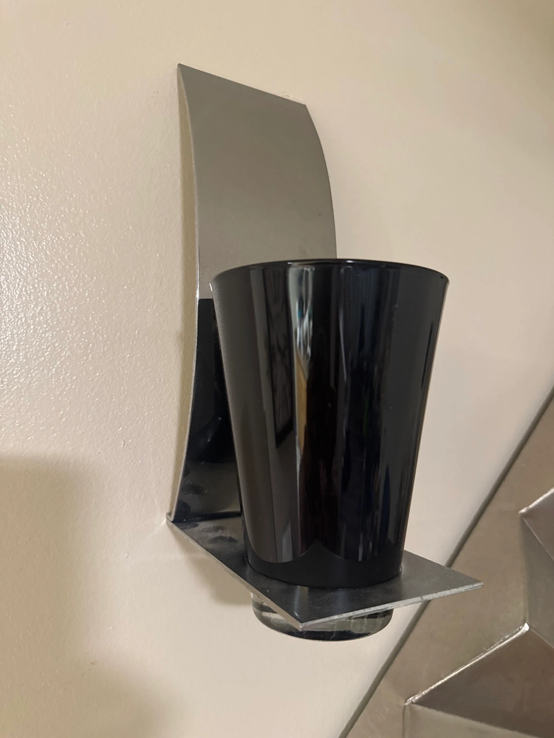 This is a wall-mounted holder designed to hold a black glass cup or vase. The holder is made of a sleek, reflective metallic material. It's suitable for holding small decorative items or a single flower.