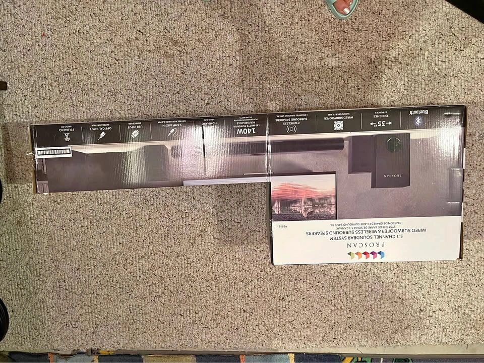 Brand new Proscan 5.1 channel soundbar system with wired subwoofer and wireless surround sound speakers. Original price $149.99.