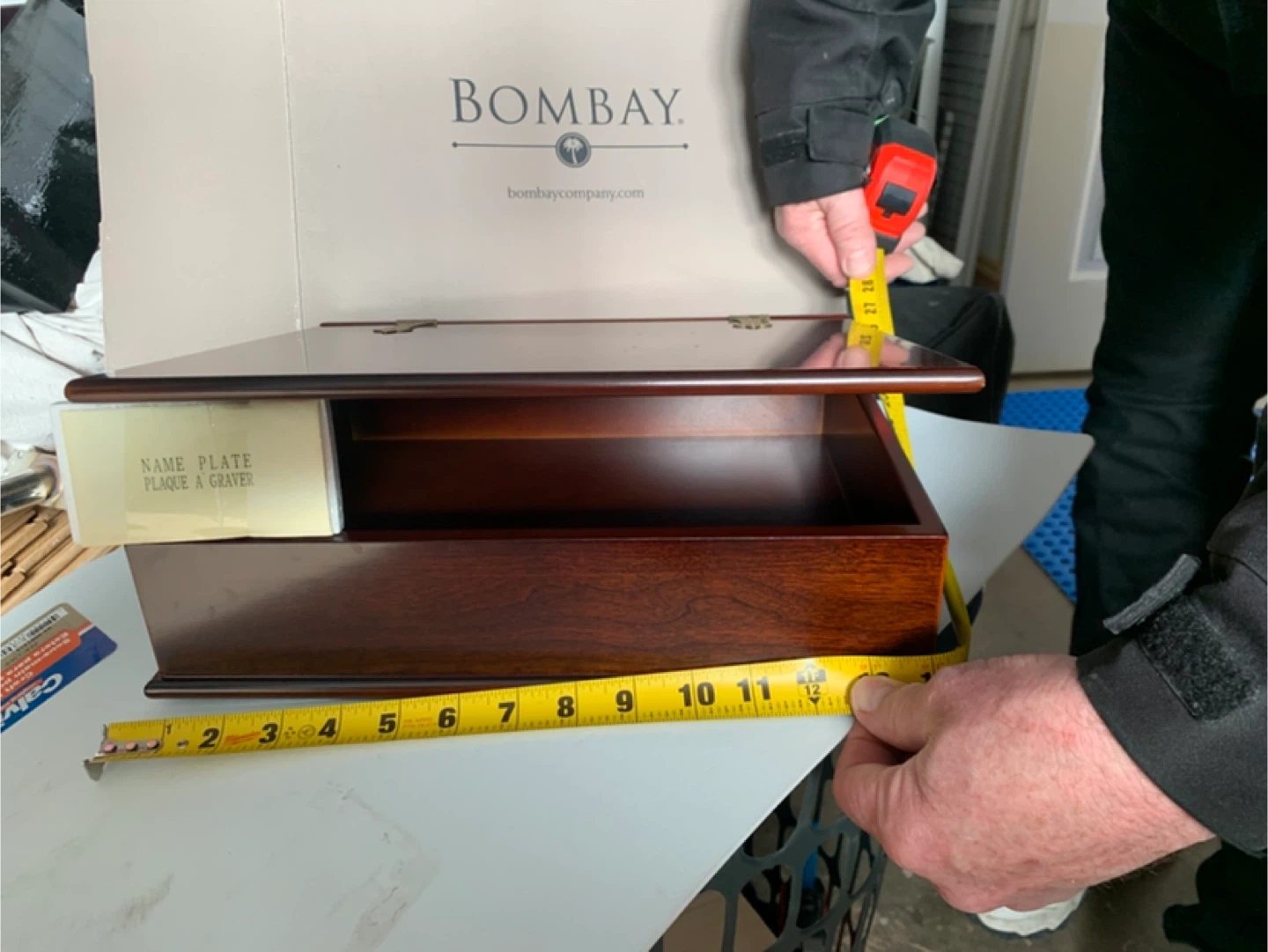 This is a Bombay Company wooden storage box. It comes with an included name plate that can be engraved. The box is made of dark wood and has a hinged lid. Measurements are approximately 10.5 inches long and 4 inches tall.