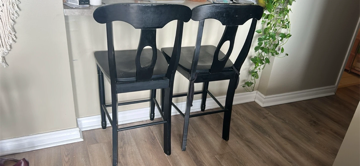 This is a set of two black wooden bar stools. They're made of solid wood with a classic design. These stools are perfect for a kitchen island or home bar!