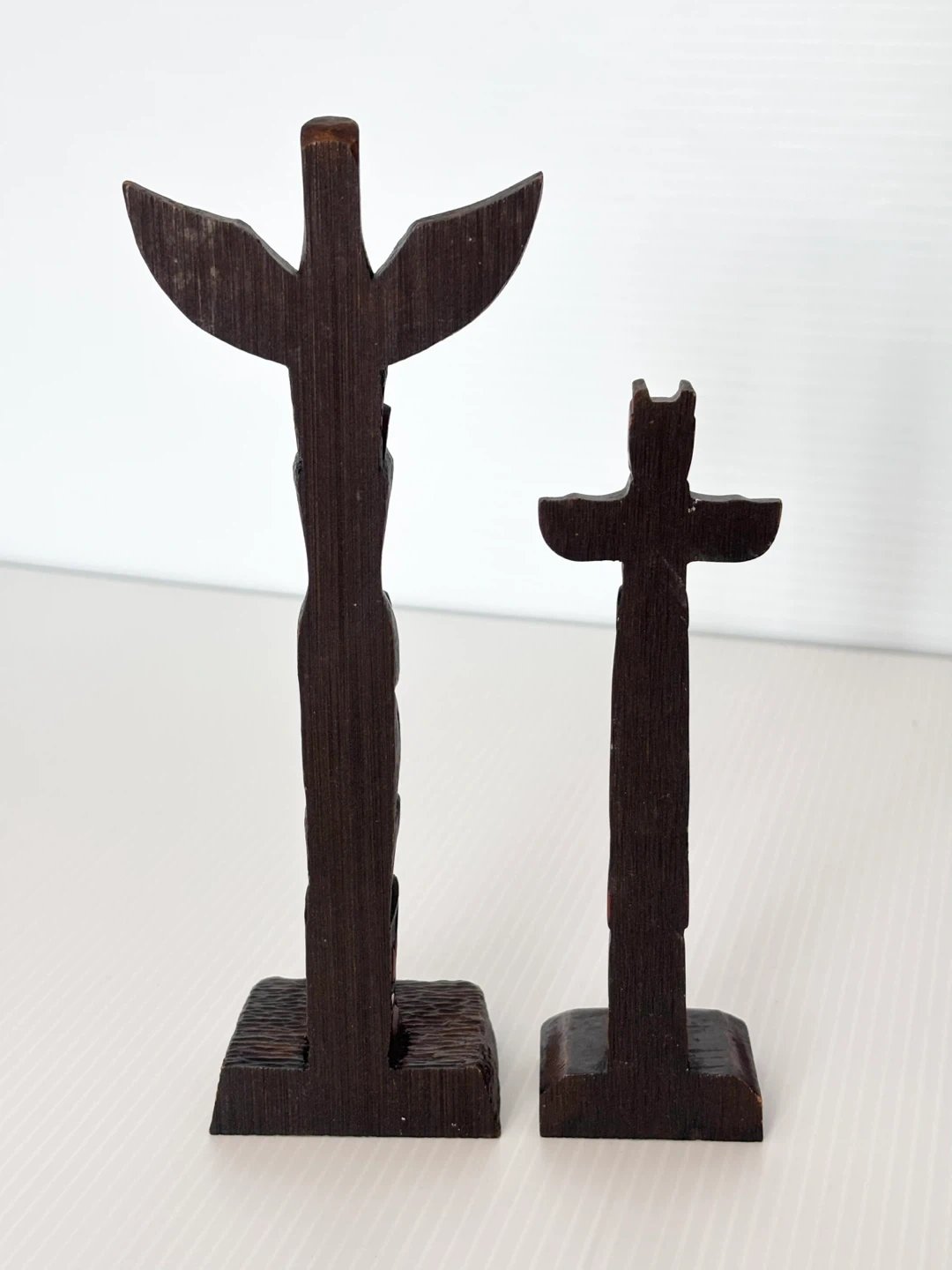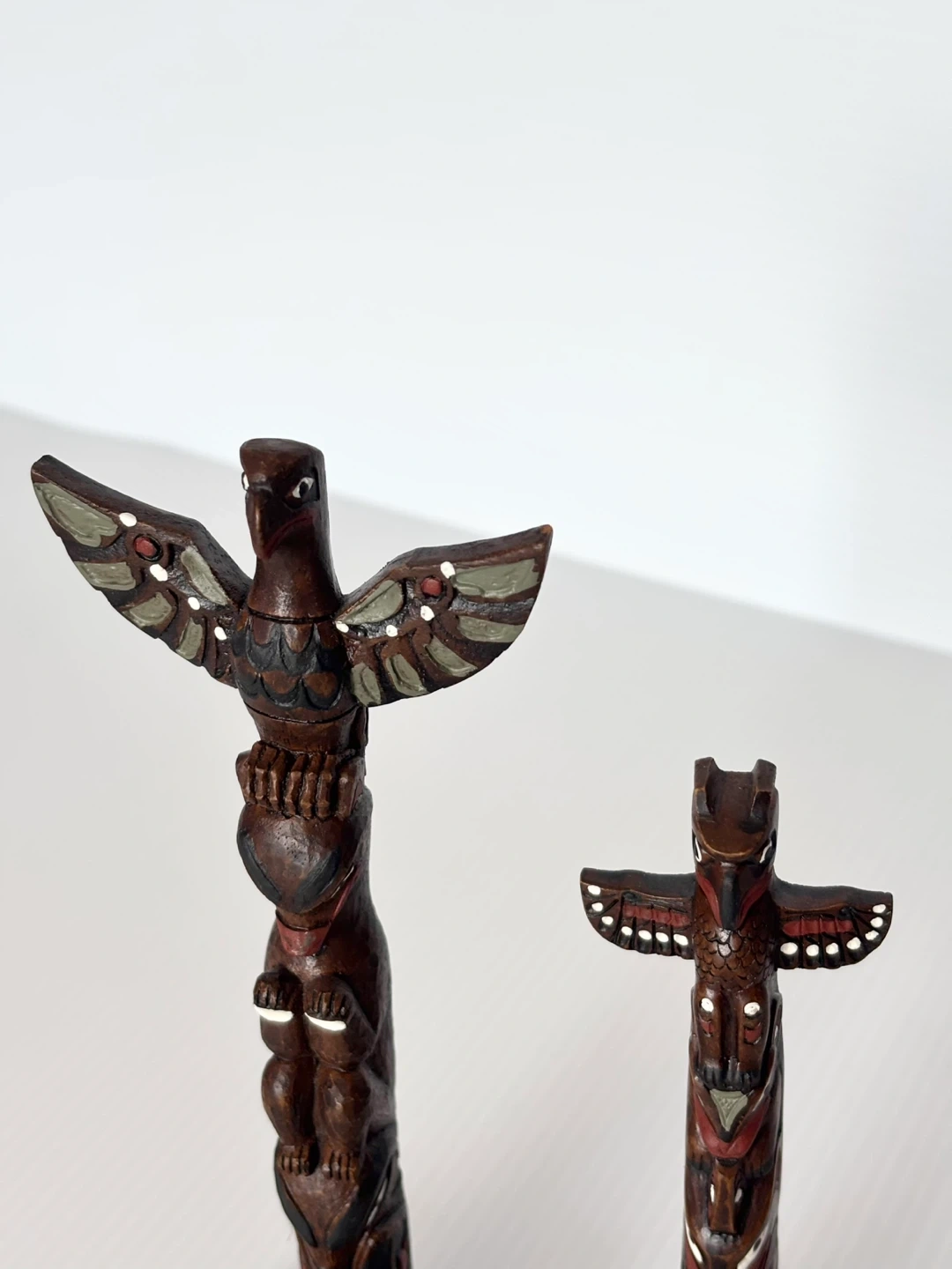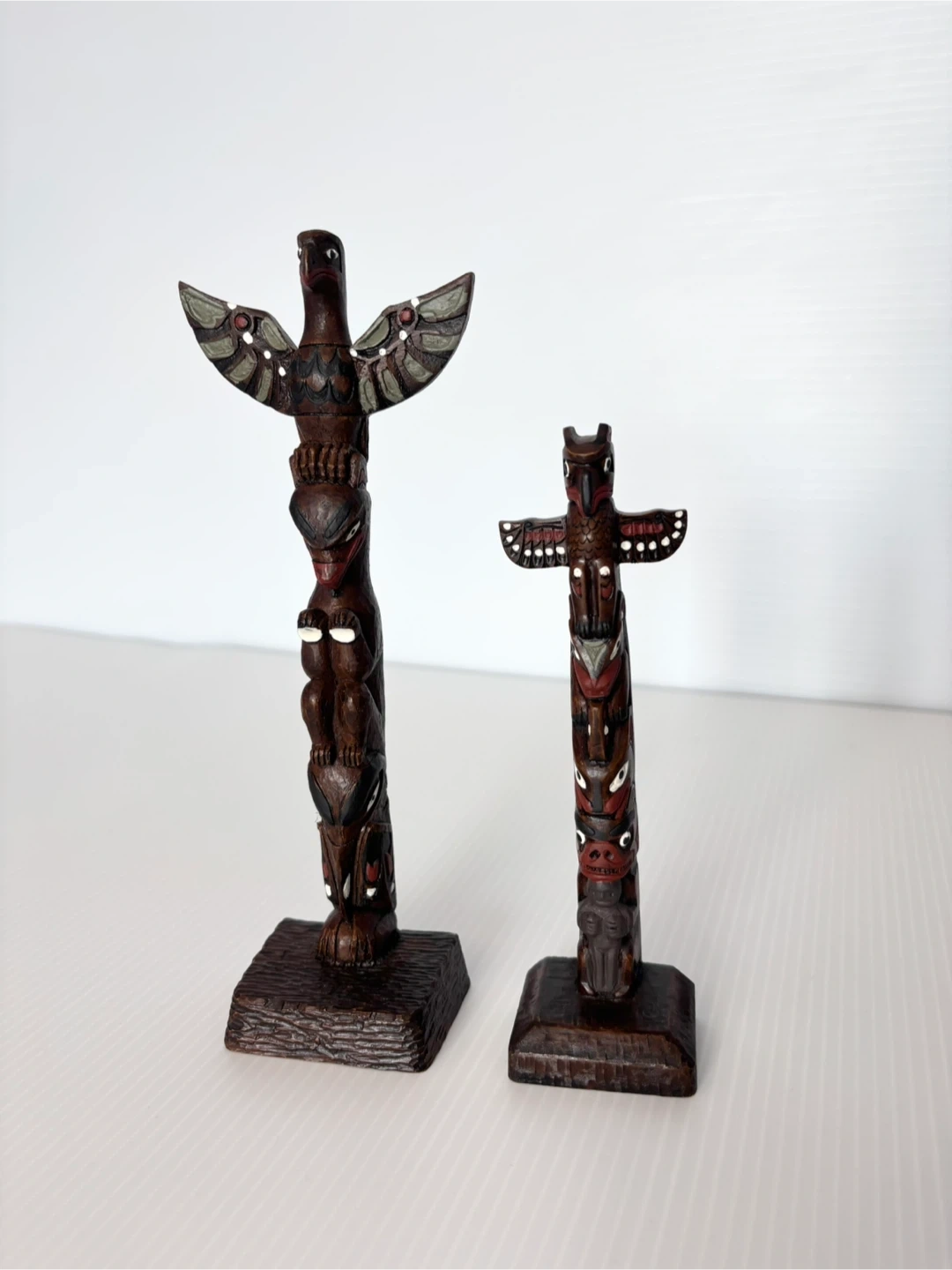 Detailed pair of BOMA carved wood totem poles. Each pole has colorful painted accents. Taller one is 8” tall. Smaller one is 6” tall. Made in Canada
