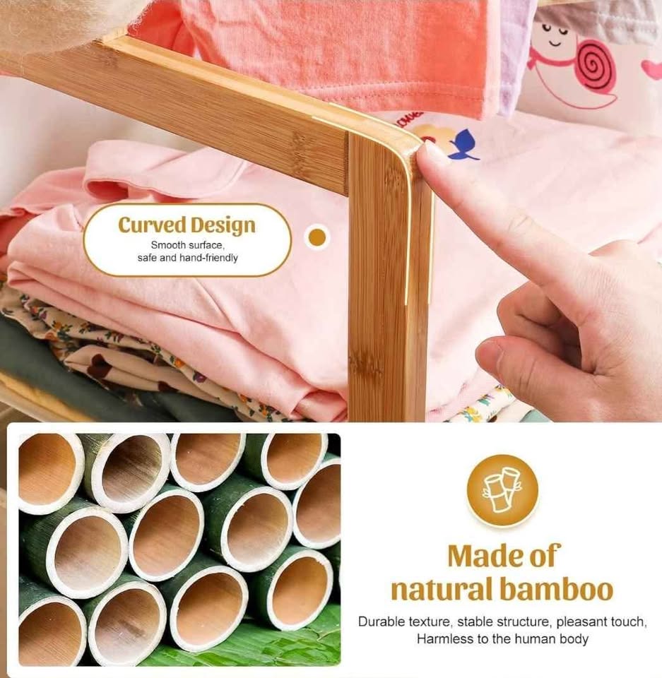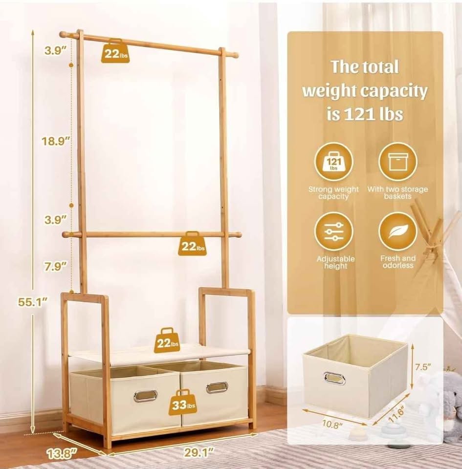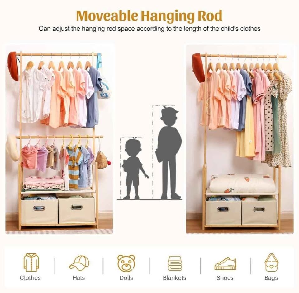 Vilaxing Kids Clothing Rack Bamboo with 2 Storage Baskets and 2 Adjustable Hanging Rods, Child Garment Holder with Shelf, Dress up Stand for Playroom, Toddlers Bedroom