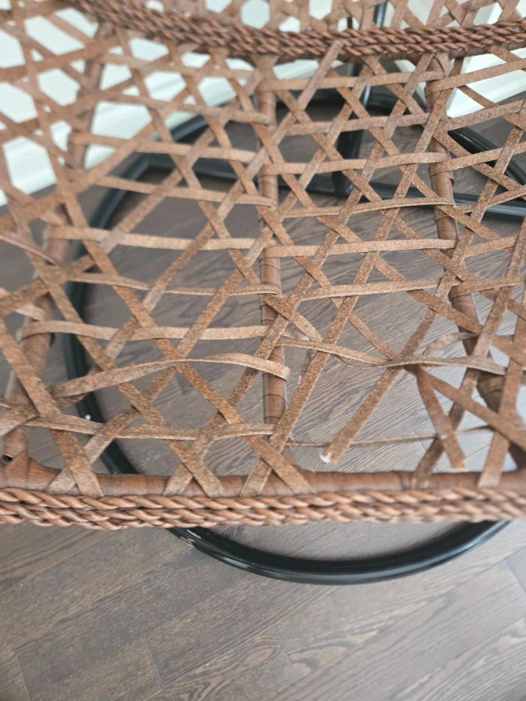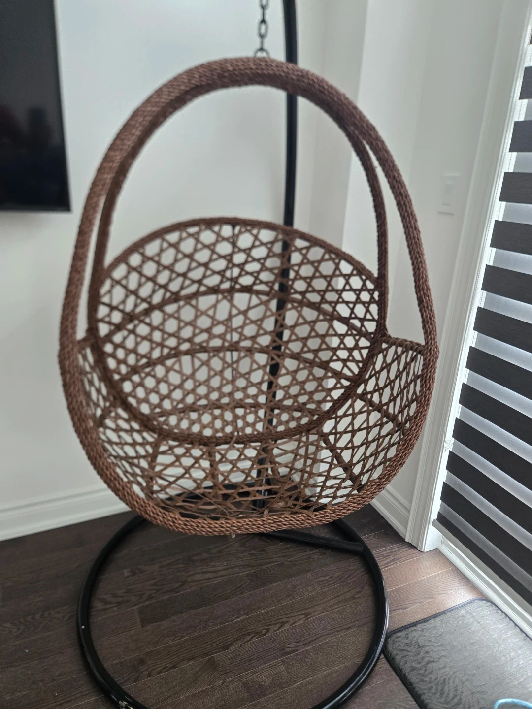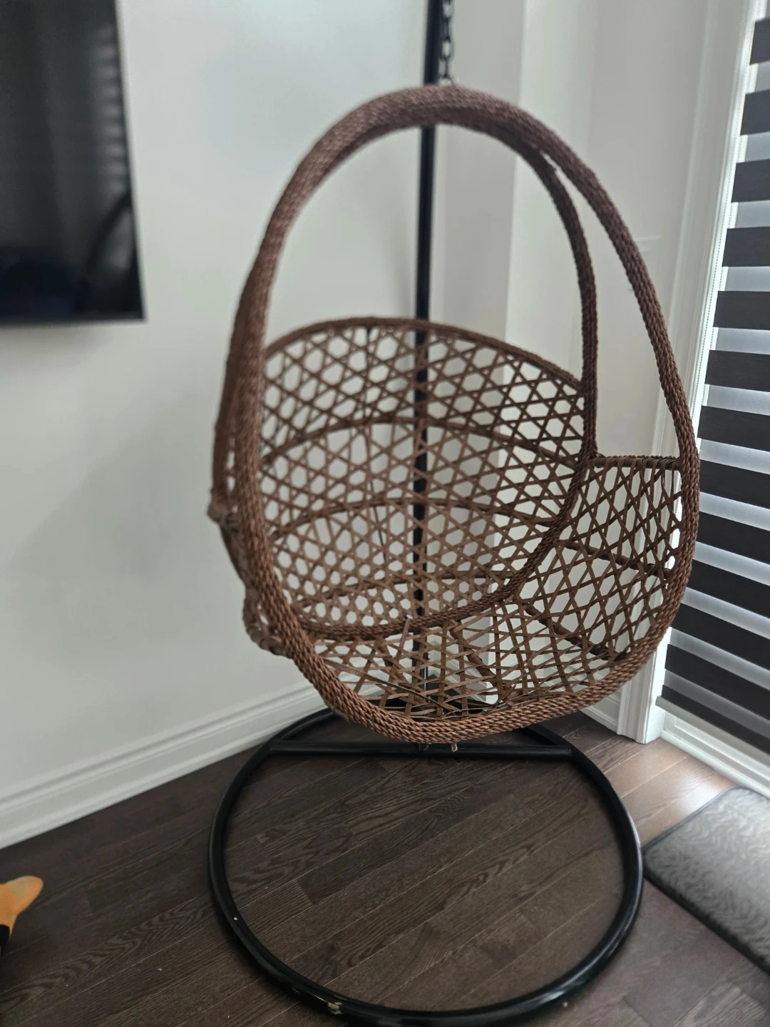 This hanging chair features a durable woven design. Its brown colour complements various decors. It's suspended from a sturdy black metal stand, perfect for a porch or indoor nook.