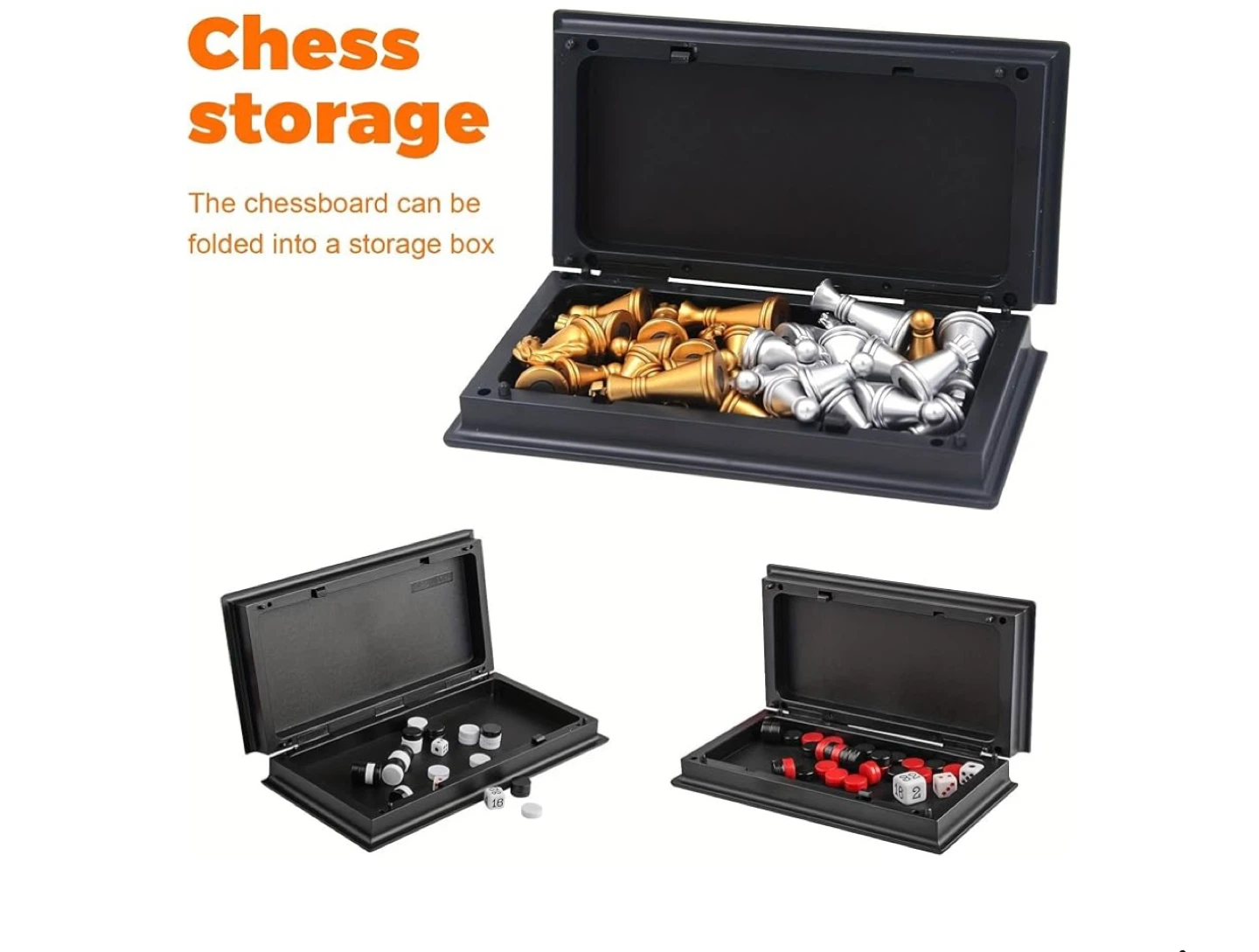 This is a 3-in-1 magnetic travel chess set, including chess, checkers, and backgammon. It features a 9" foldable board with gold and silver magnetic pieces. The set also comes with 2 black dice, 2 white dice, and 1 numbered die. It's small and easy to carry, perfect for travel!