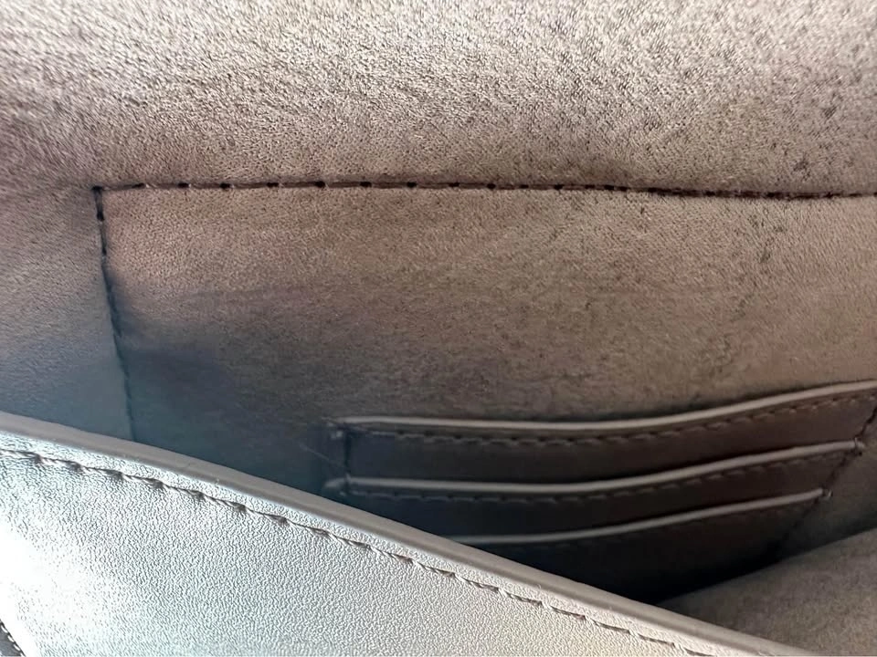 Never been used. Features 2 compartments and 3 card holders on one side. The removable strap allows it to be used as a clutch with its top handle, or as a shoulder/crossbody bag.