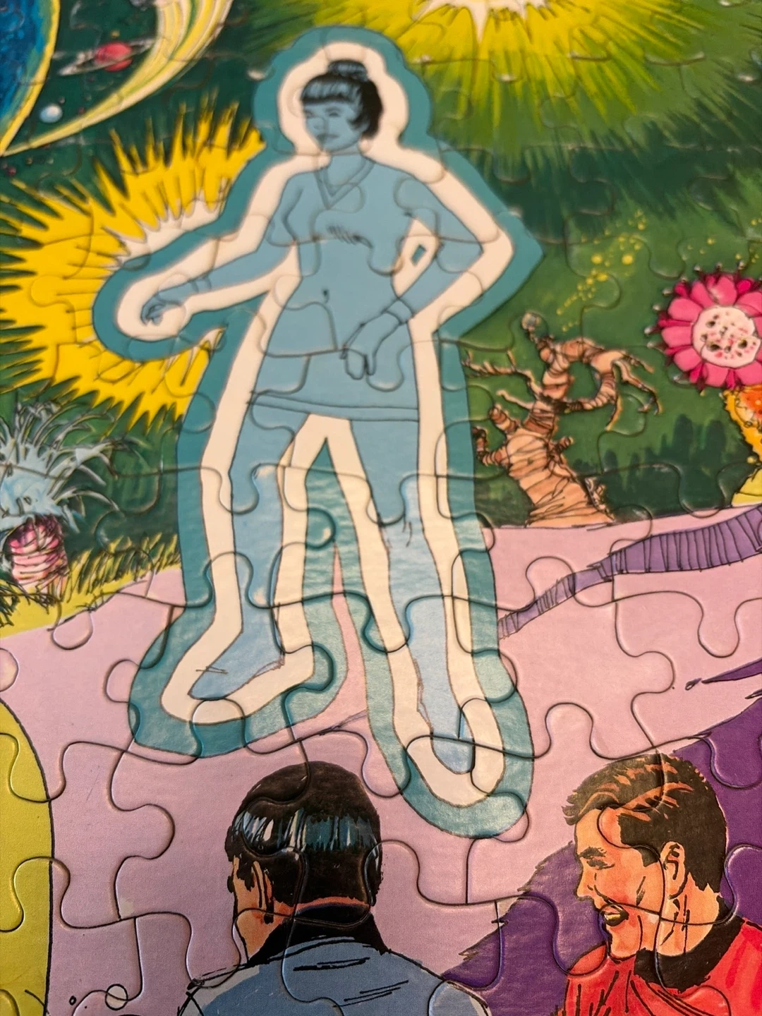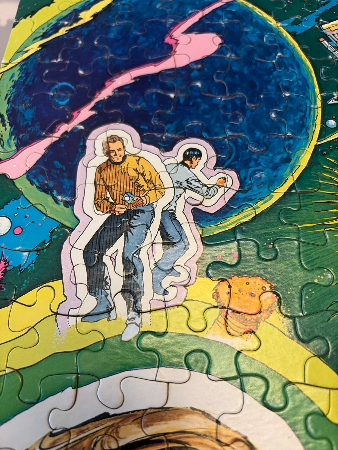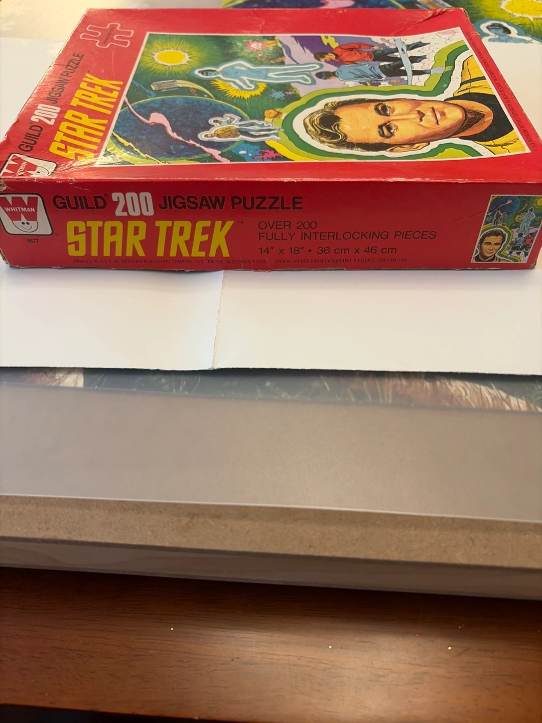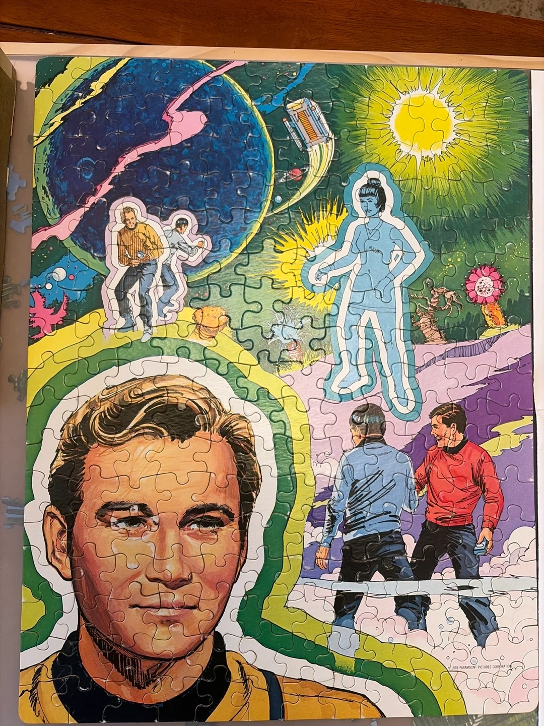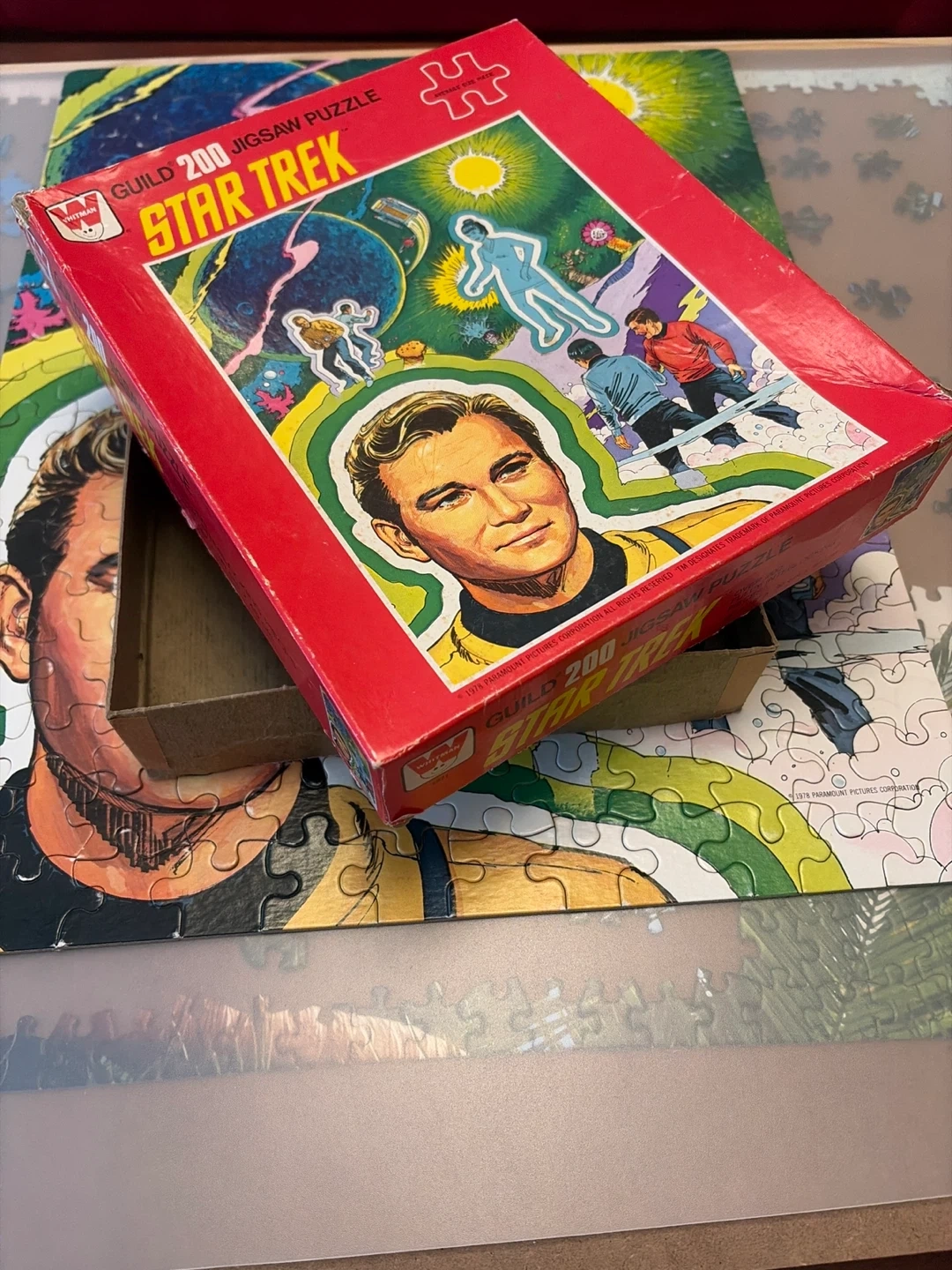 This vintage Guild 200 piece jigsaw puzzle from 1978 features Star Trek characters. It measures 14" x 18". Pieces are all present and complete. Some wear and tear on the box and a few pieces but in good condition overall.