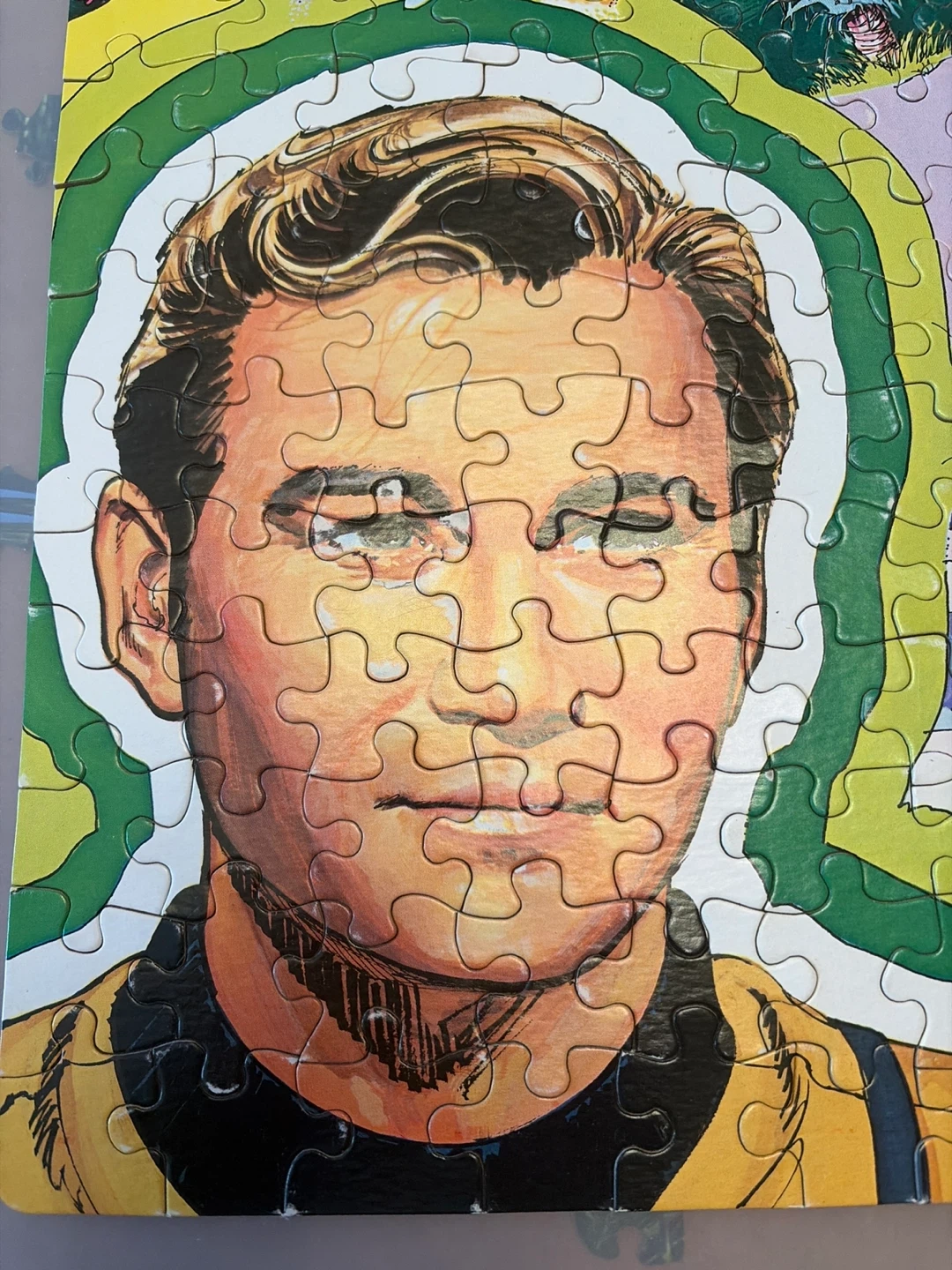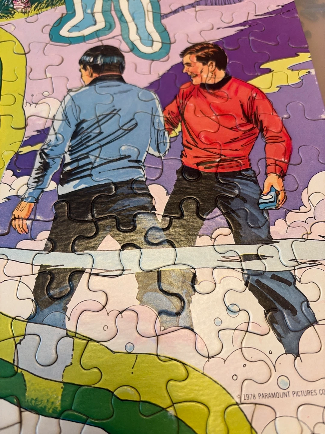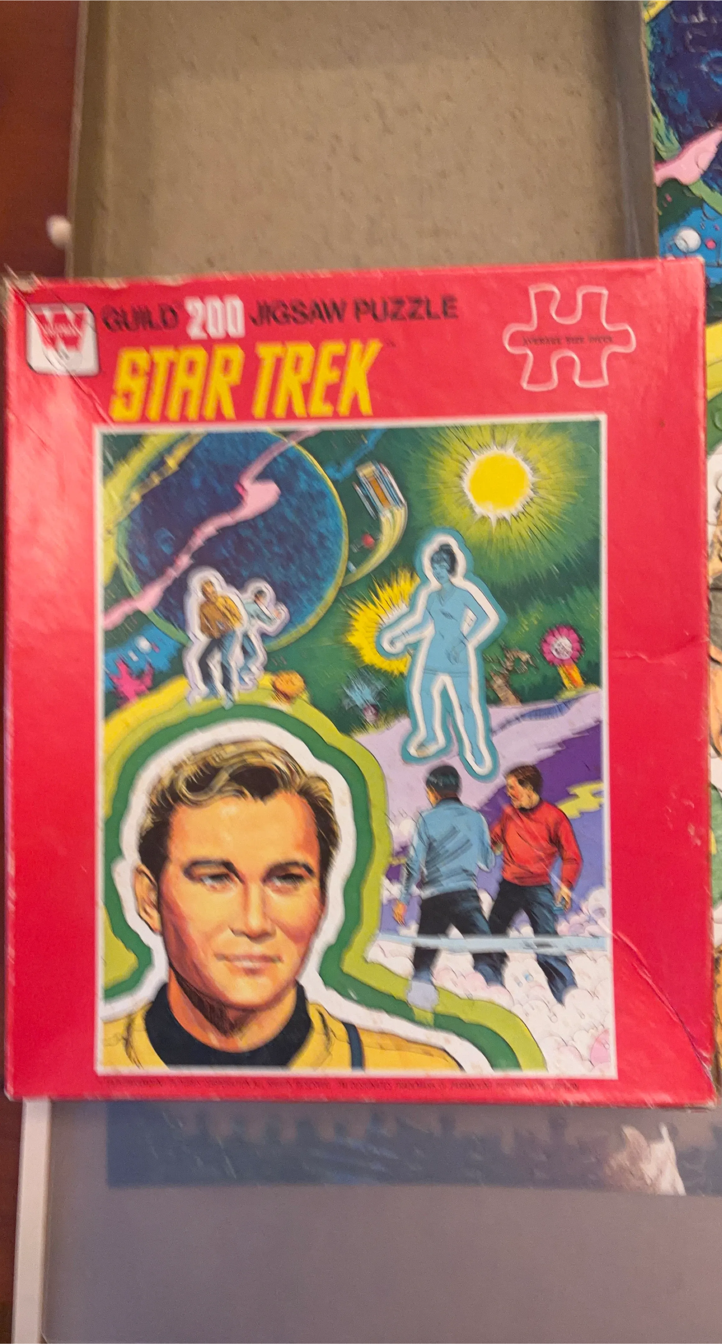 This vintage Guild 200 piece jigsaw puzzle from 1978 features Star Trek characters. It measures 14" x 18". Pieces are all present and complete. Some wear and tear on the box and a few pieces but in good condition overall.