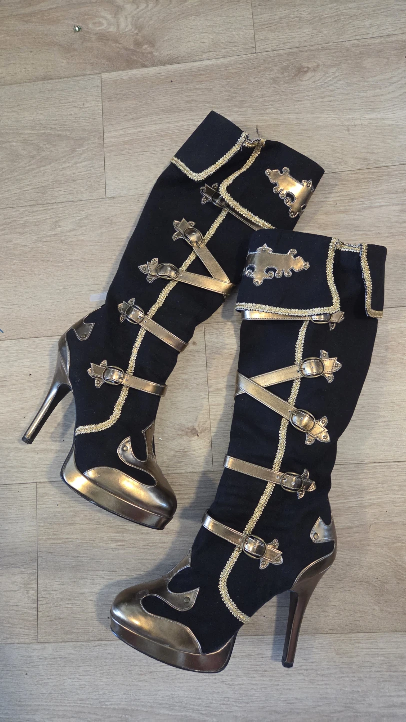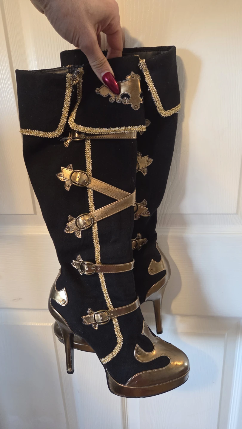 Stylish black knee-high boots with ornate gold buckle and trim detailing. These boots feature a stiletto heel and a platform front. Great for a statement look!