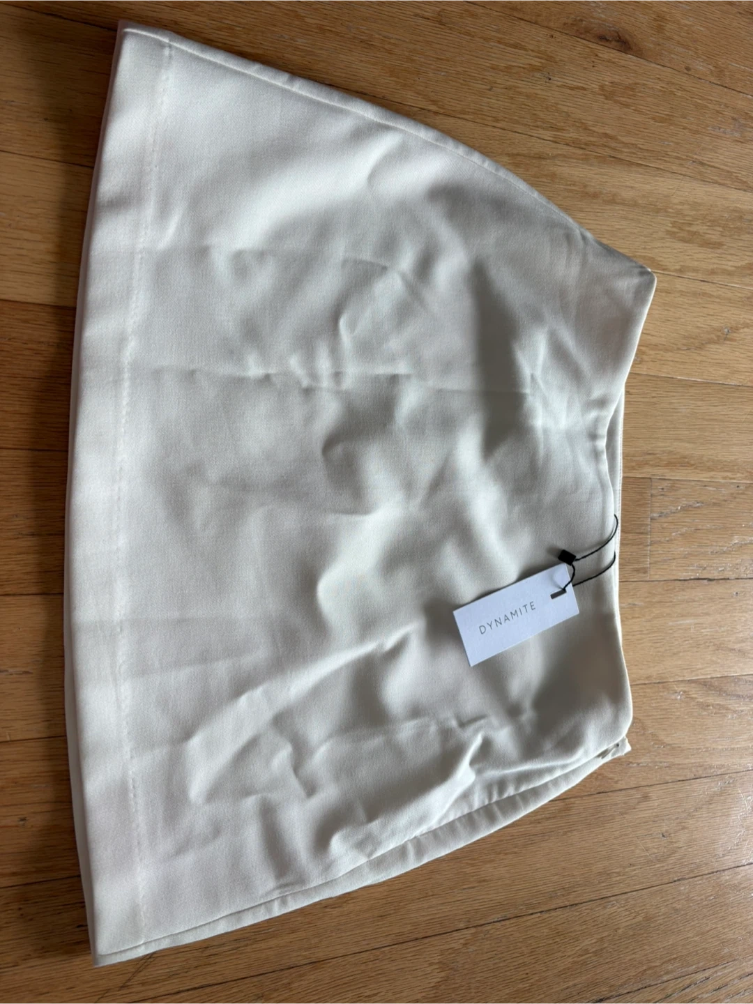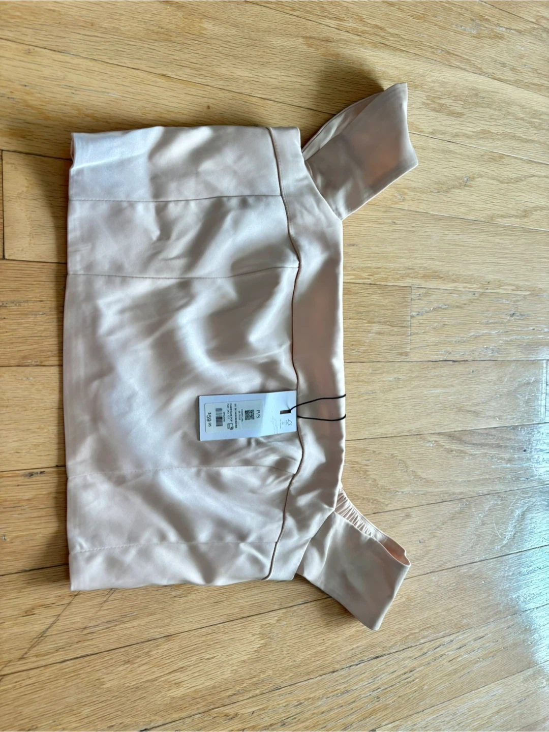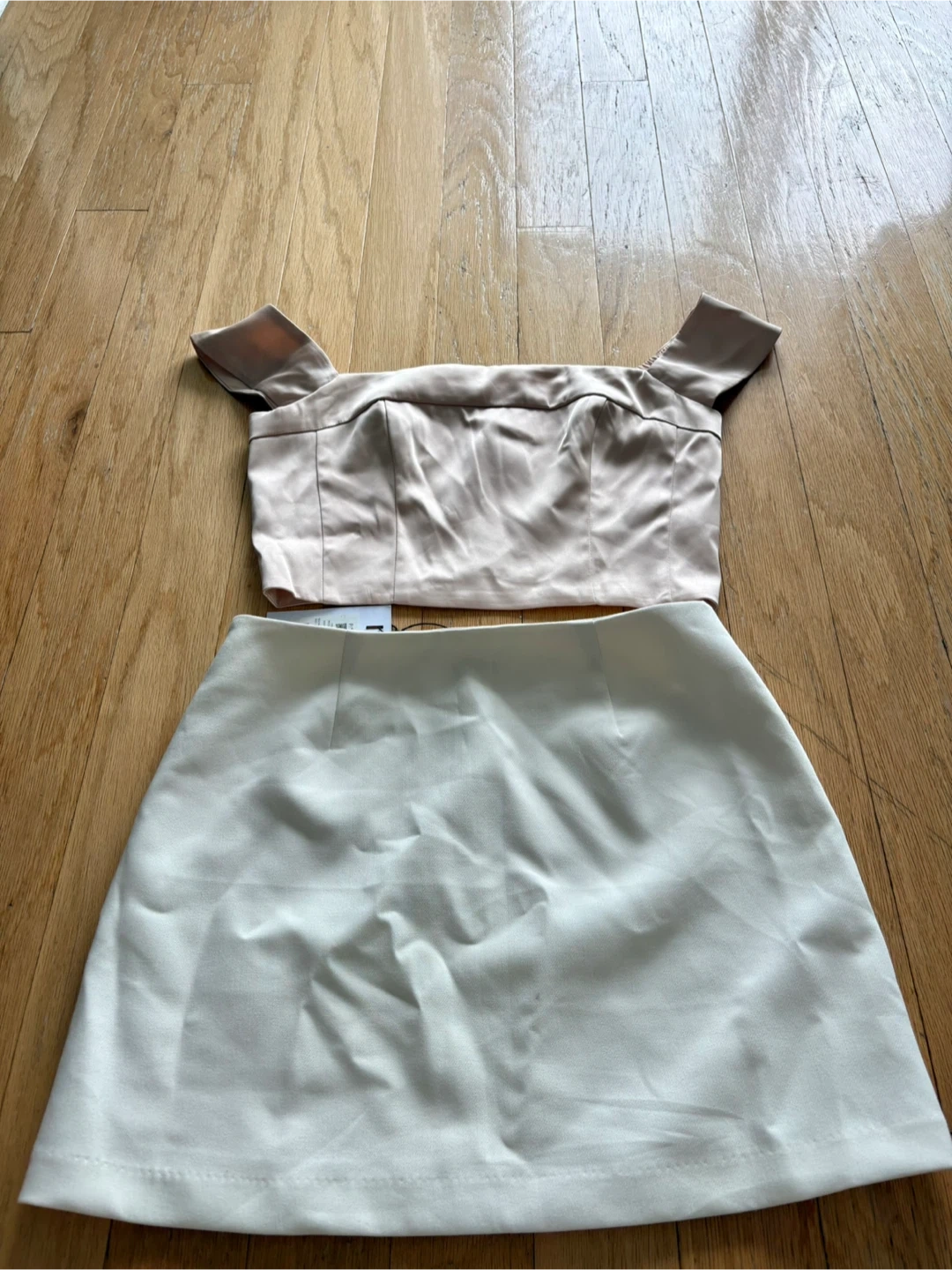 This Dynamite set features a chic pink satin off-the-shoulder top and a beige skirt. Both items have tags attached. The top is made of a silky material, and the skirt is a structured fabric.