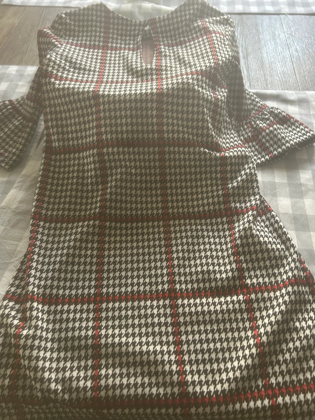 This dress features a classic houndstooth pattern with bold red checks. . Dress it up or down for various occasions!