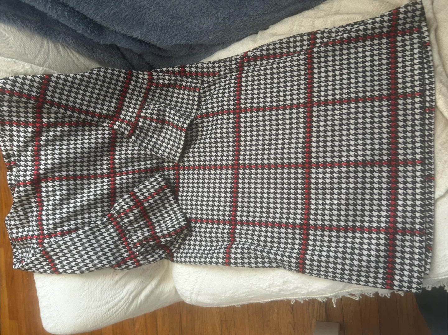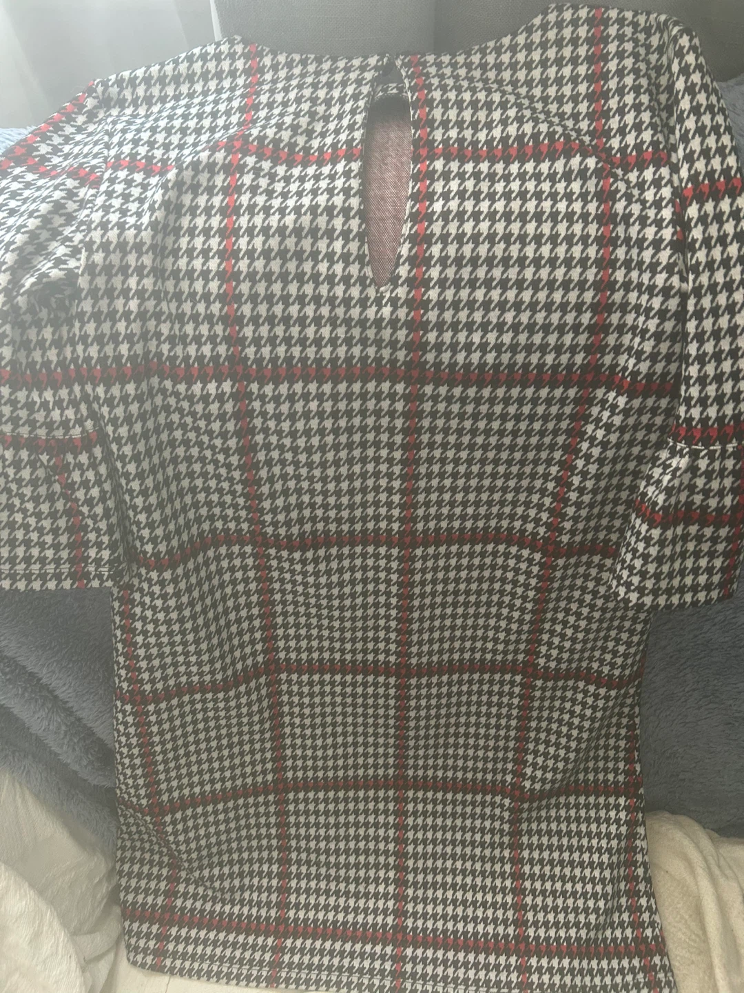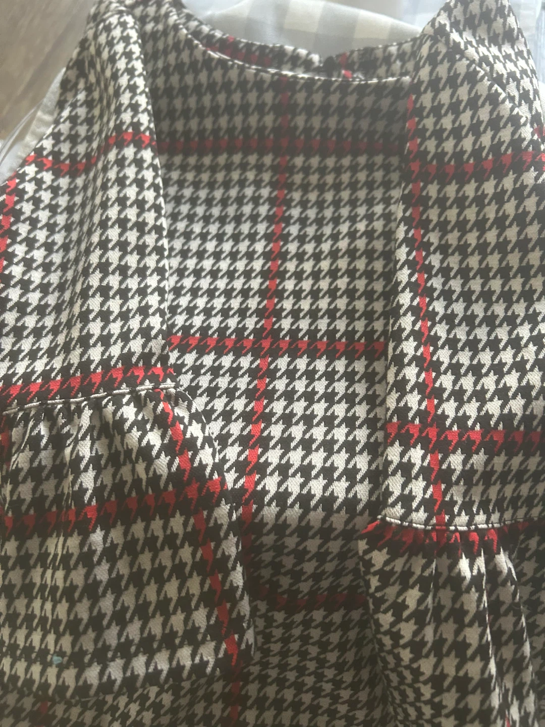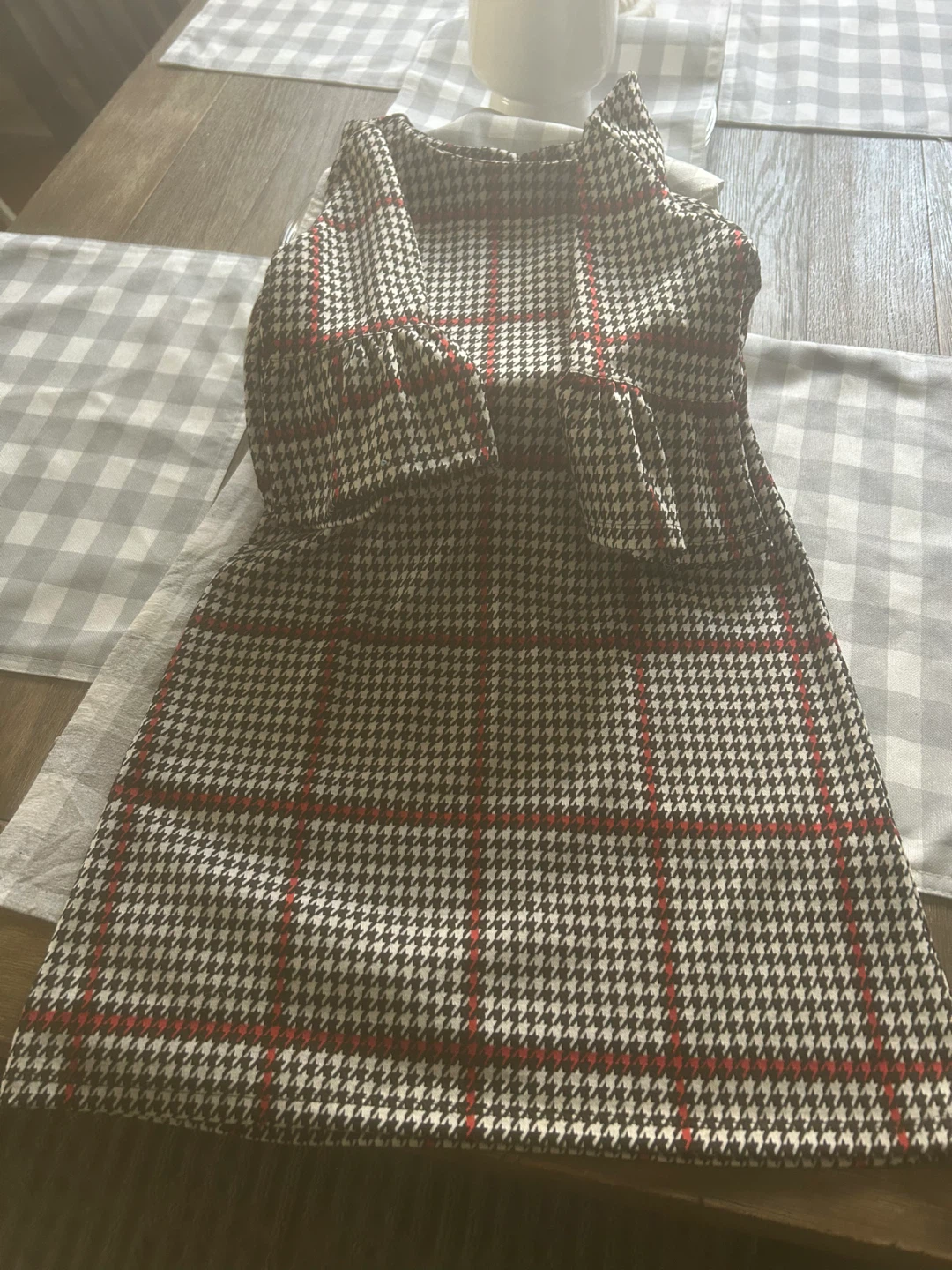 This dress features a classic houndstooth pattern with bold red checks. . Dress it up or down for various occasions!