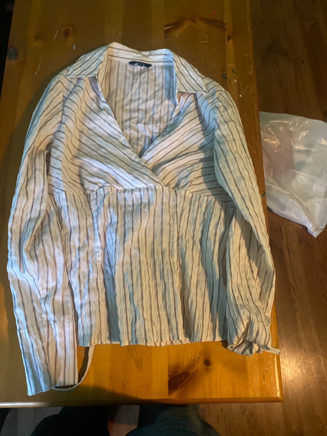 A light, collared blouse with vertical stripes. It has long sleeves and a V-neckline. Material appears to be a blend, possibly cotton or linen.