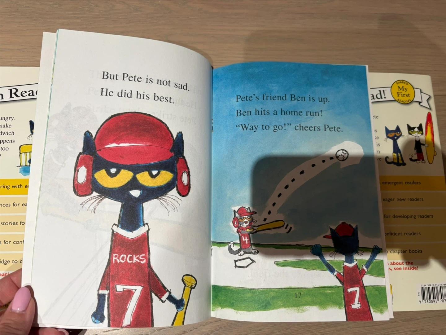 This is a set of three 'Pete the Cat' books from the 'I Can Read!' series. Titles include 'Pete's Big Lunch', 'Pete the Cat: Play Ball!', and 'Pete at the Beach'. These books are great for emergent readers. One book’s bottom right corner is bent.