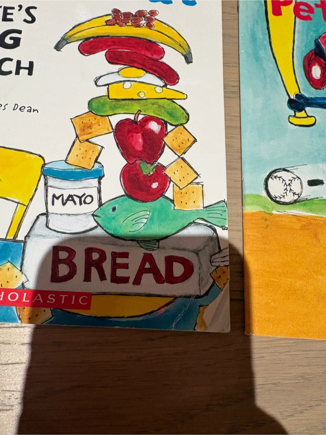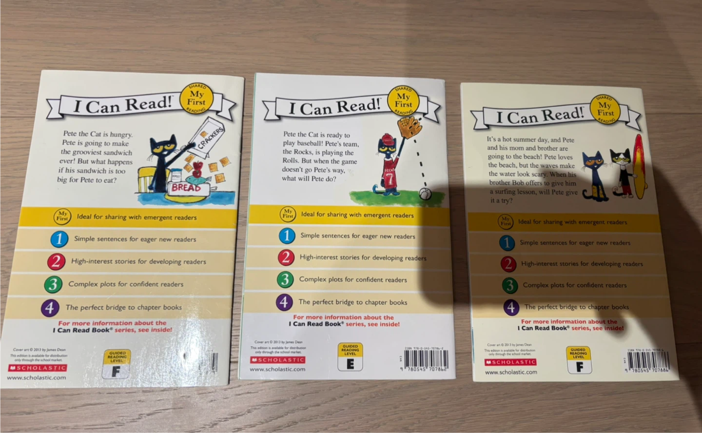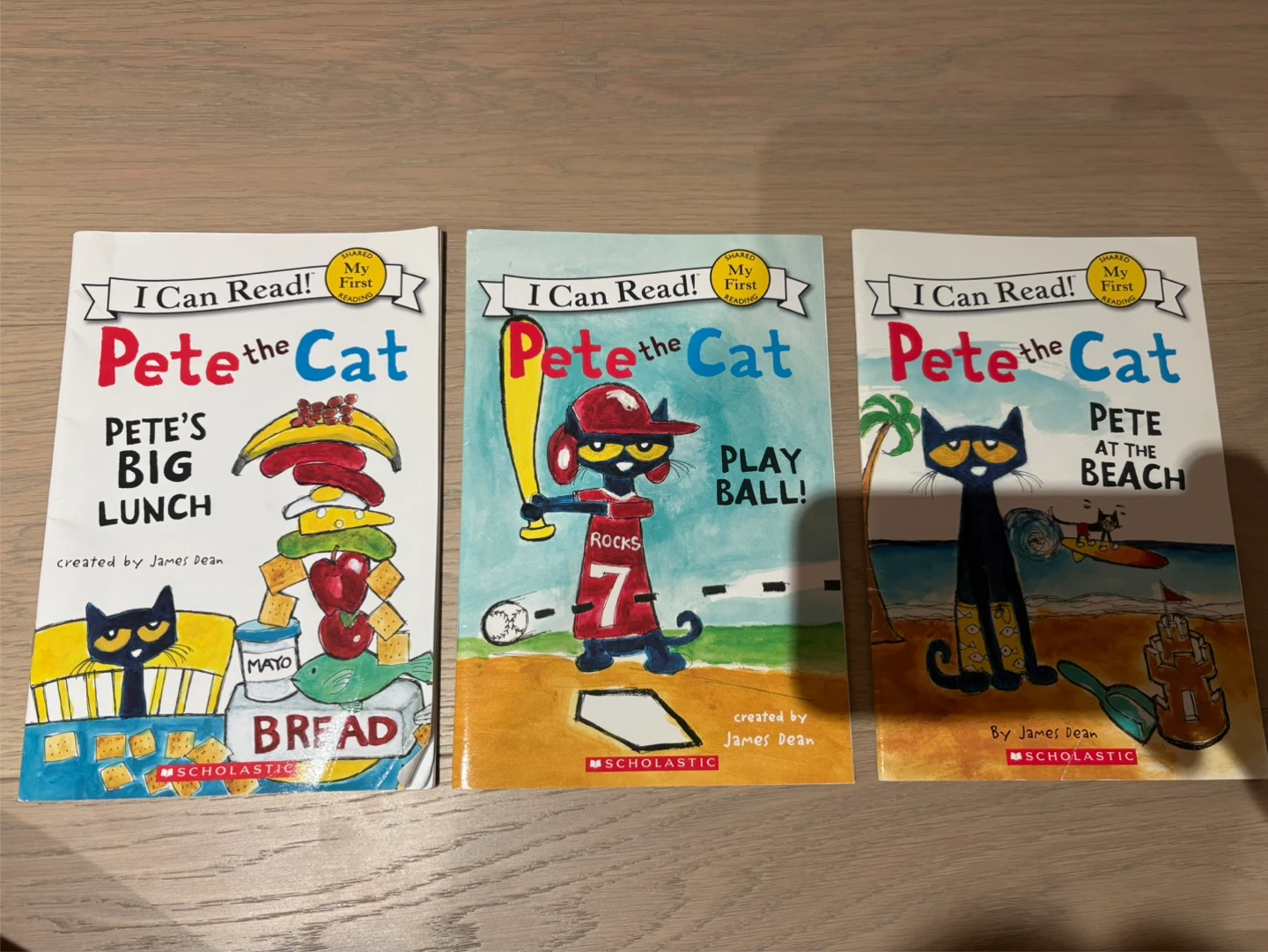 This is a set of three 'Pete the Cat' books from the 'I Can Read!' series. Titles include 'Pete's Big Lunch', 'Pete the Cat: Play Ball!', and 'Pete at the Beach'. These books are great for emergent readers. One book’s bottom right corner is bent.