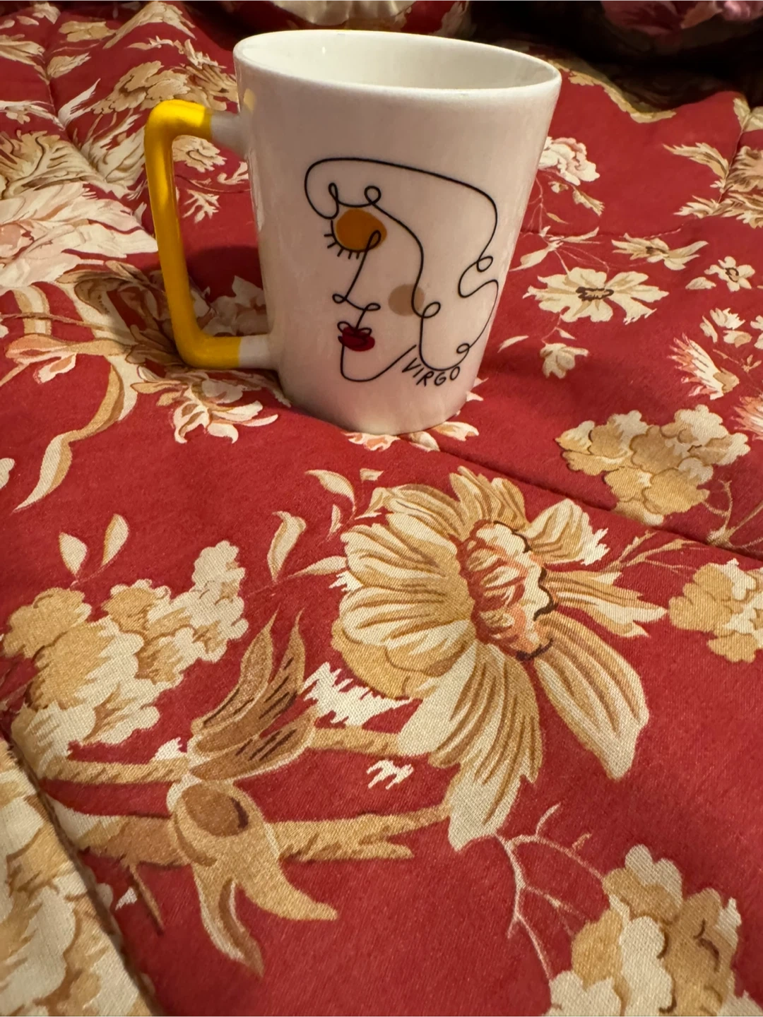 This white ceramic mug features an abstract line drawing of a face with the word 'VIRGO' inscribed. It has a bright yellow, uniquely shaped handle. It's perfect for enjoying your morning coffee or tea!