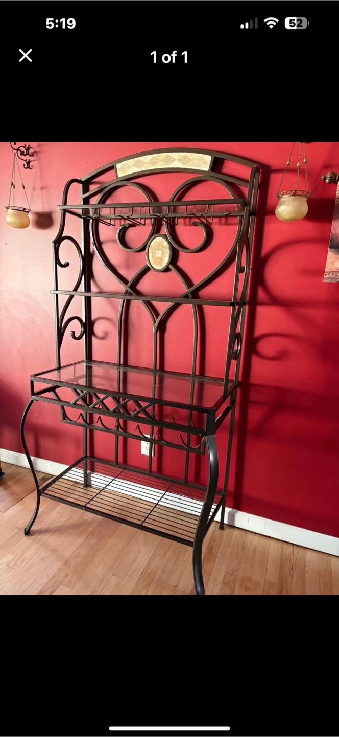 This is a metal baker's rack with glass shelves. It has a decorative design and is perfect for adding storage and style to your kitchen or dining area. It also has wine glass holders.