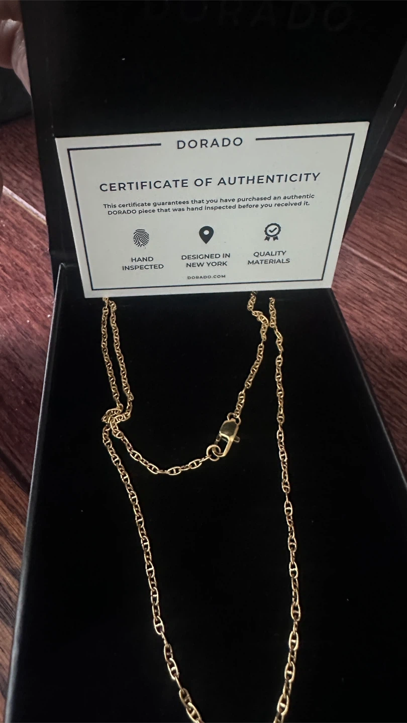 Authentic DORADO gold chain necklace, designed in New York and hand inspected. Includes original certificate of authenticity. Box packaging present.