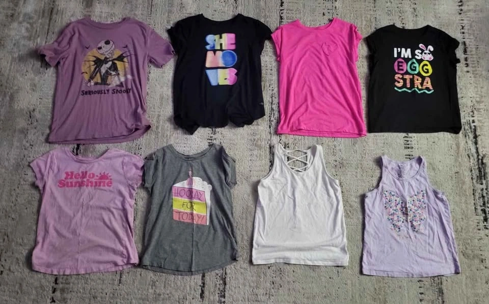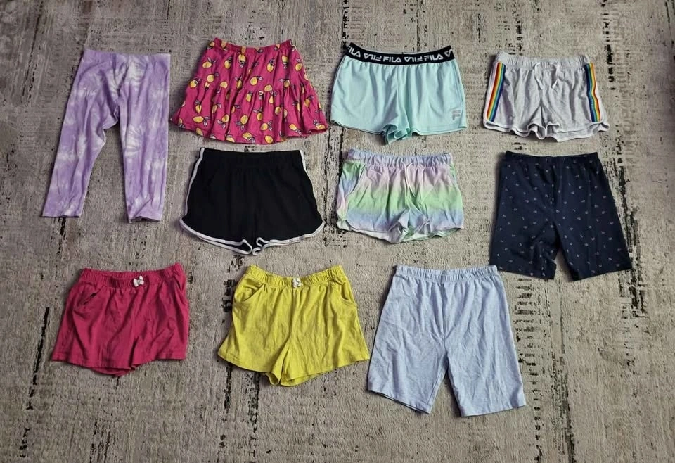 Girls size 14-16 Spring/Summer clothes. Lot #1. Mostly George, Old Navy and Children's Place brands. Includes: 3 dresses, 1 romper, 1 legging, 7 T-shirts, 2 sleeveless tops, 1 top/shorts pajama set, 1 capri pant, 1 skort, and 8 shorts. Cash only.