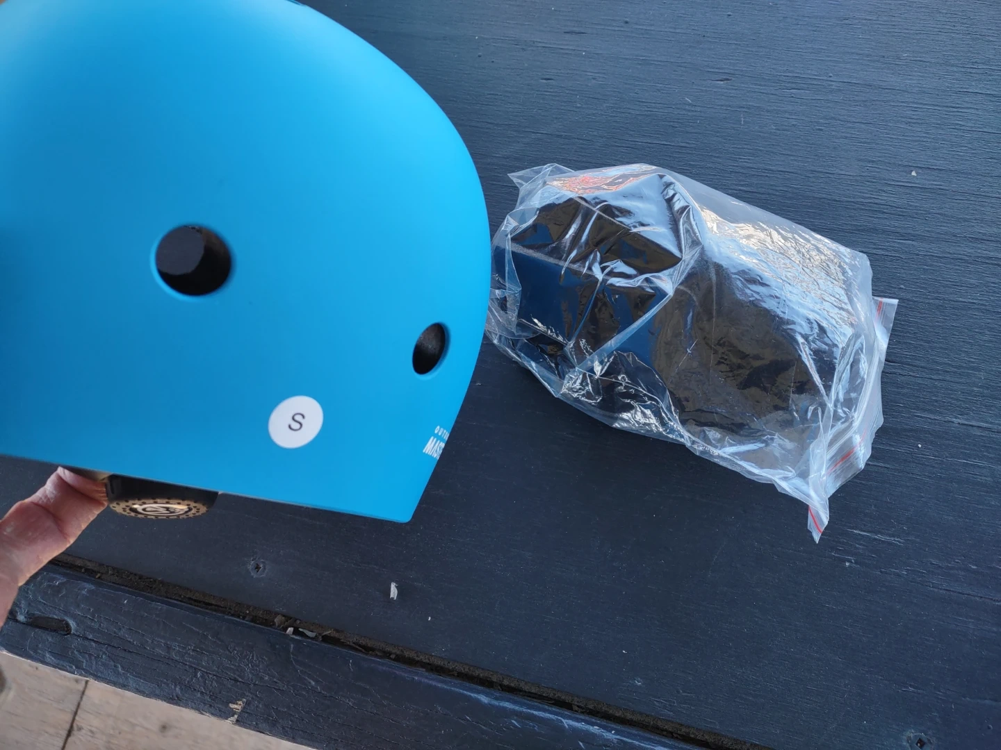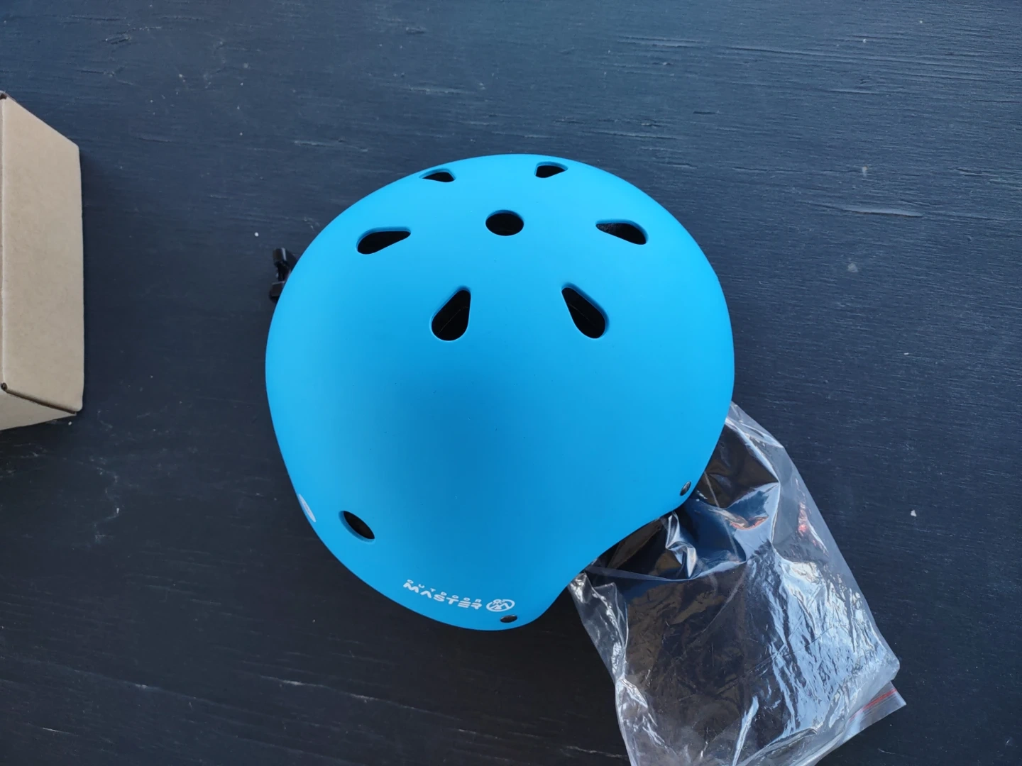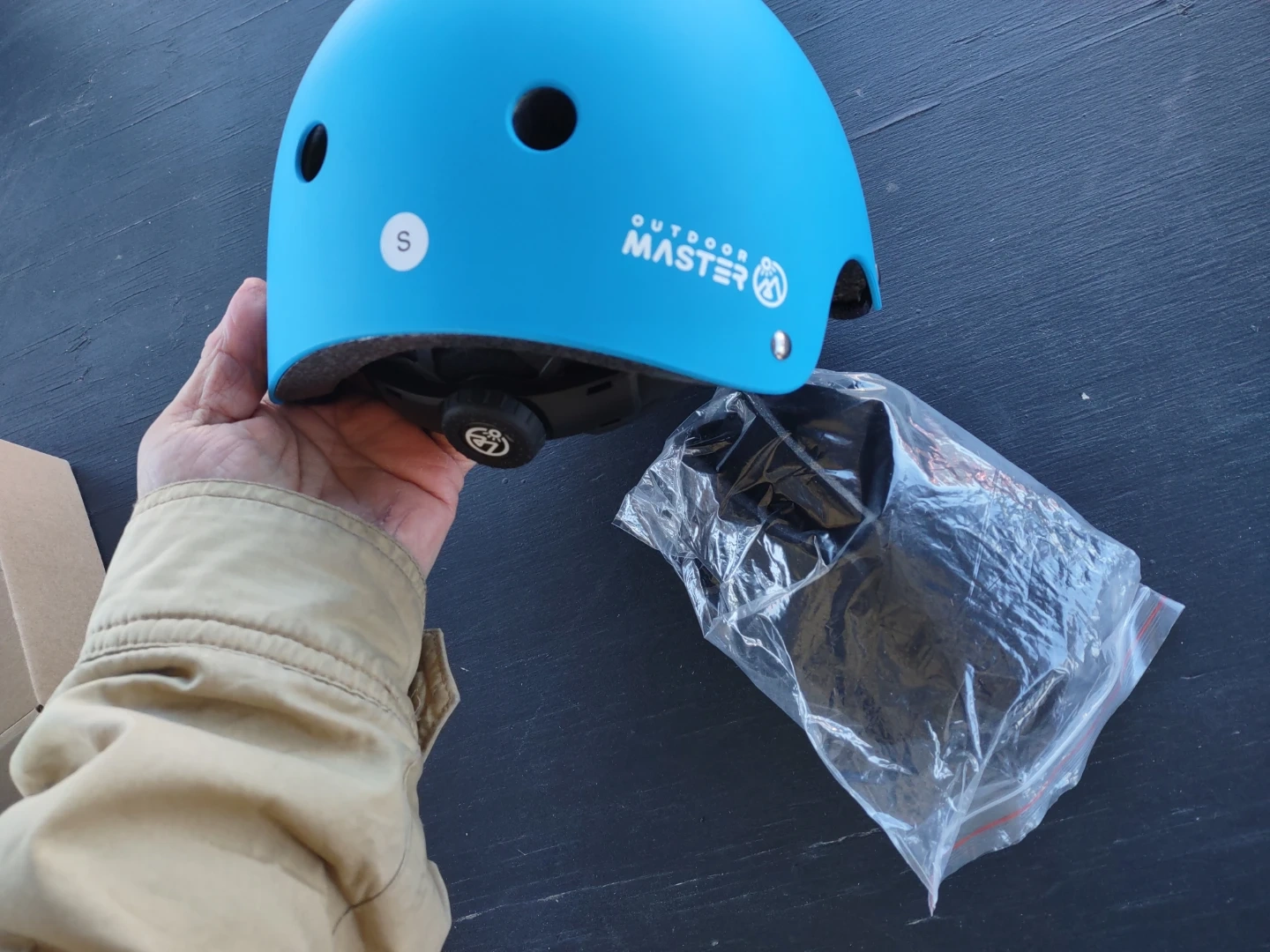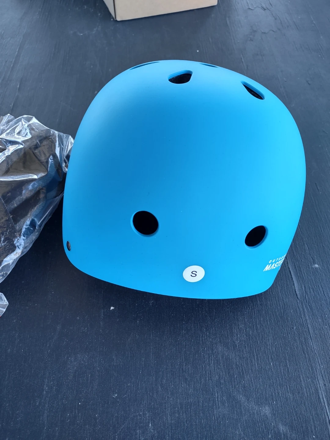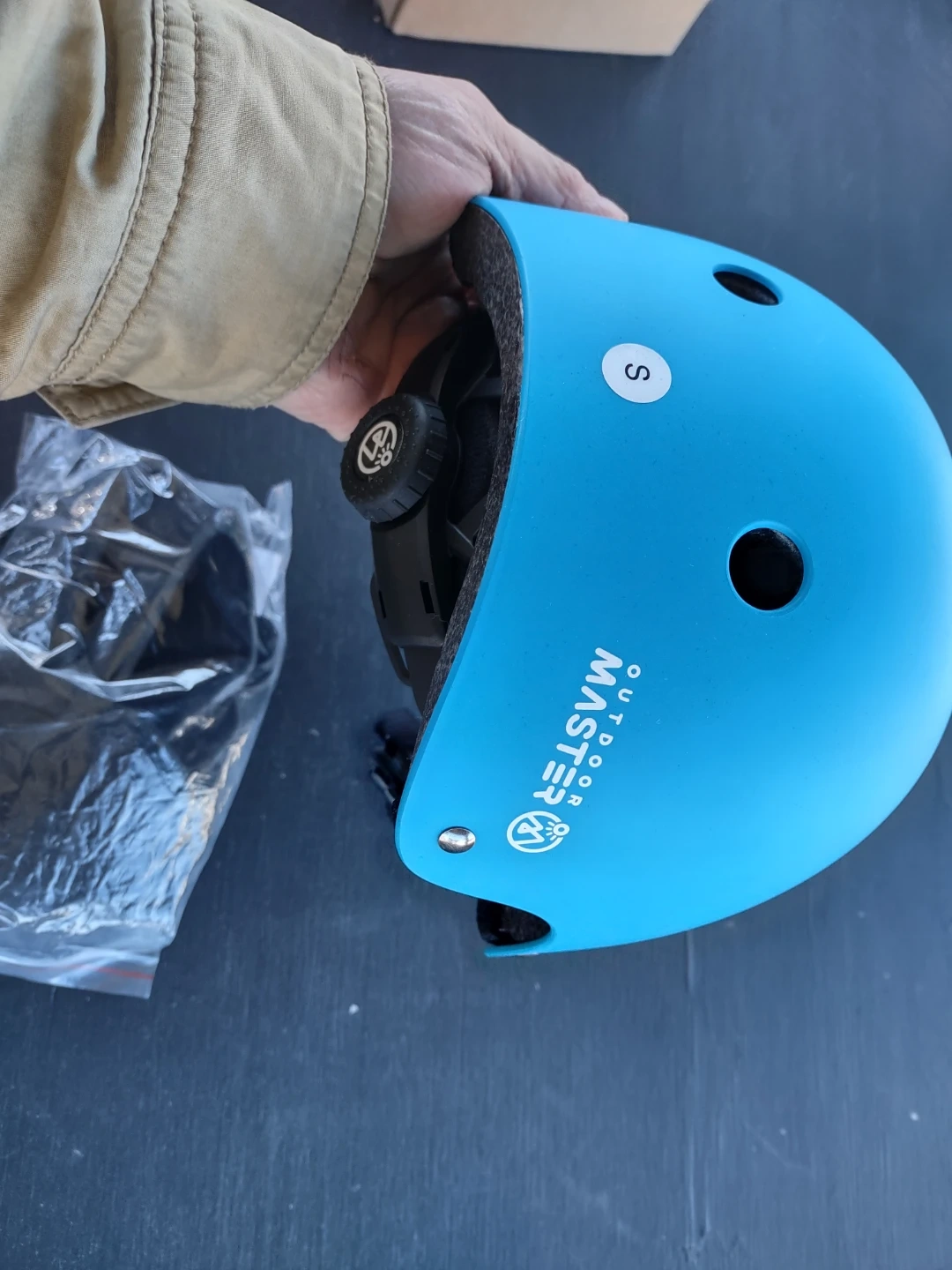 This is a blue OutdoorMaster kids helmet. It's a size S with an adjustable dial for a snug fit. It has a lightweight design with ventilation holes. Perfect for cycling, skateboarding, or scootering!