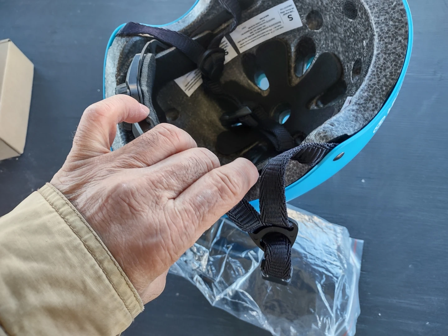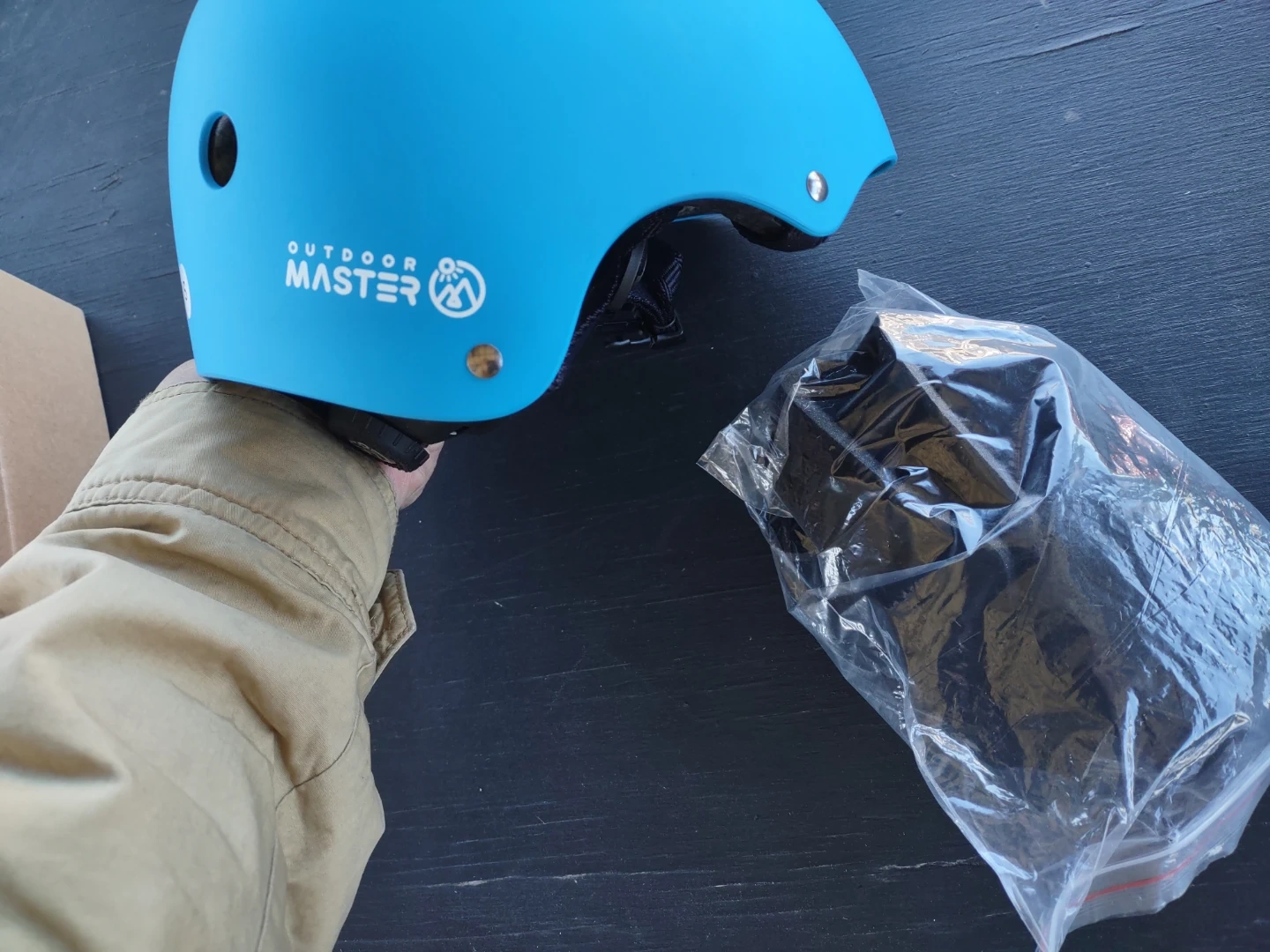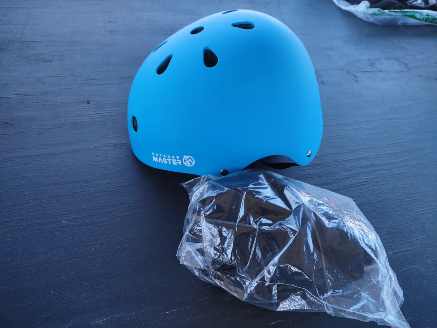 This is a blue OutdoorMaster kids helmet. It's a size S with an adjustable dial for a snug fit. It has a lightweight design with ventilation holes. Perfect for cycling, skateboarding, or scootering!