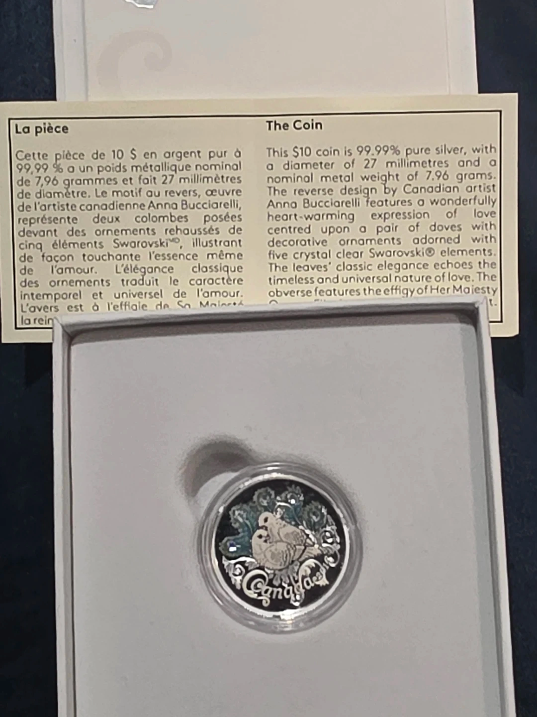 This $10 coin is 99.99% pure silver with a diameter of 27 millimetres and a nominal metal weight of 7.96 grams. The reverse design features two doves. It includes five crystal elements.