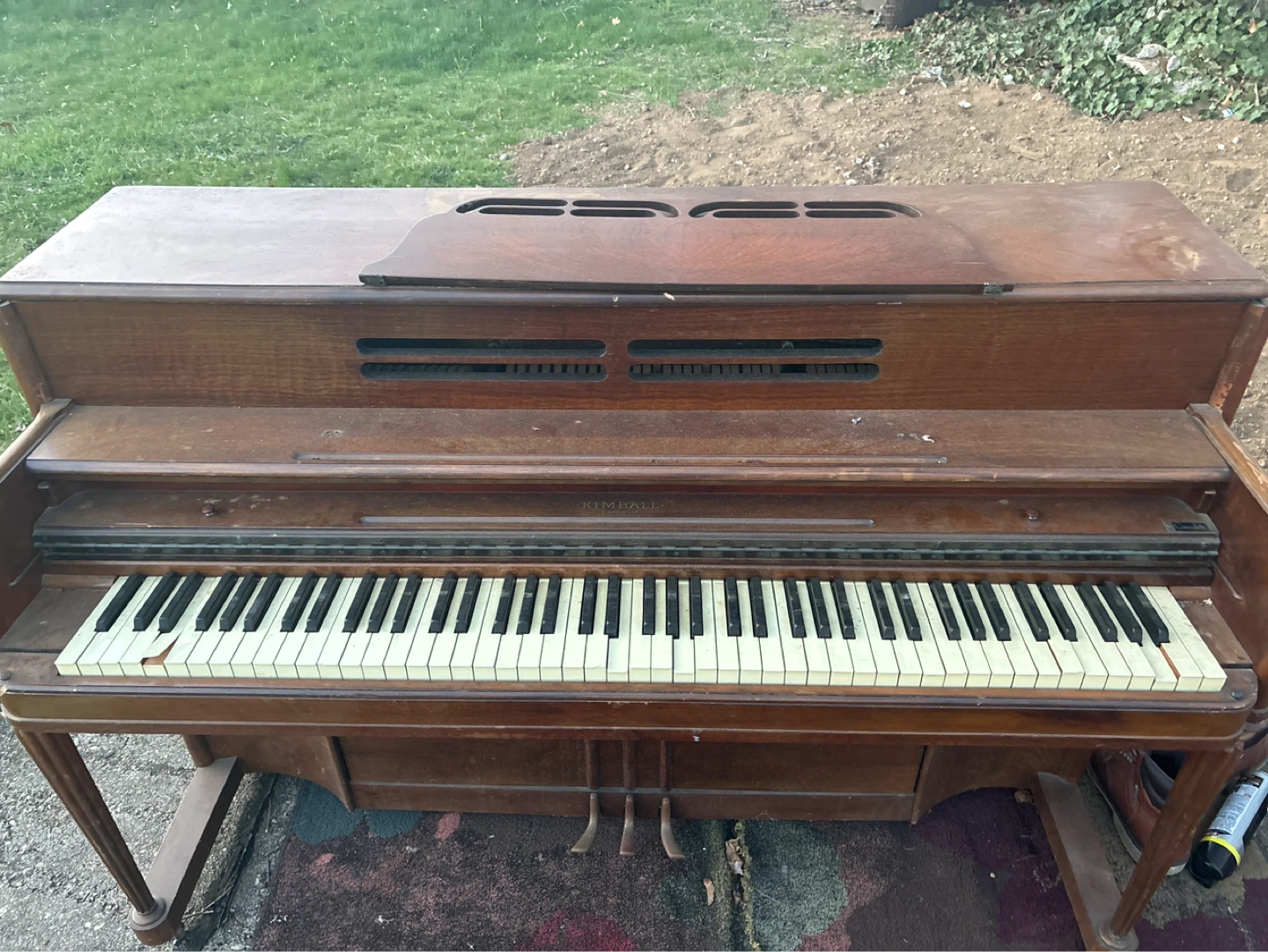 Upright piano by Kimball. Features a wooden cabinet and keys. This is a vintage piece, likely needing restoration. Perfect for musicians interested in restoring an instrument or for decorative purposes.
