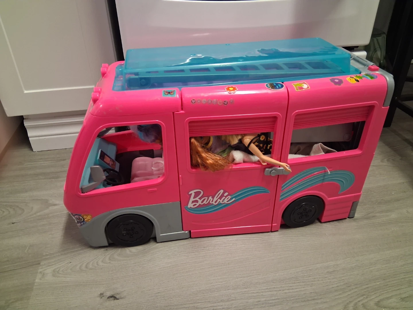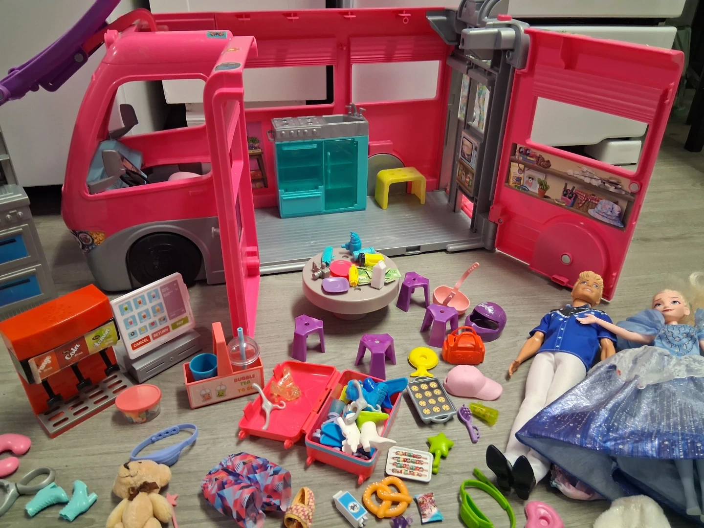 This pink Barbie camper van opens up to reveal a fun playset! It comes with multiple dolls and a variety of accessories for endless adventures. It's perfect for imaginative play.