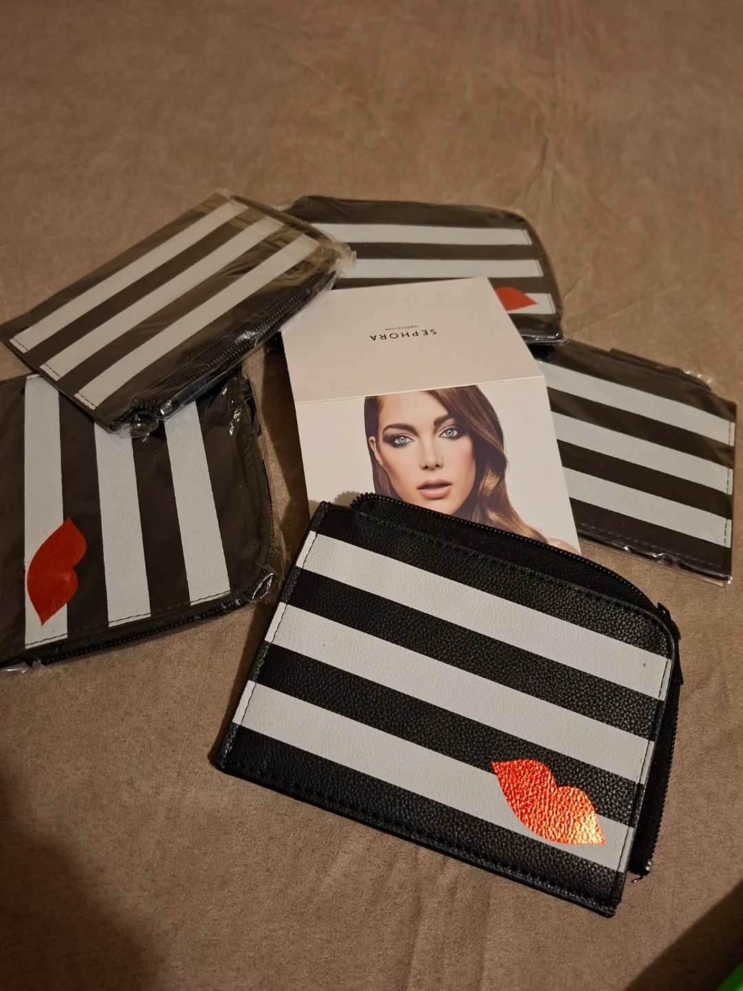 Get organised with this set of five Sephora makeup pouches! They feature a classic black and white stripe design with a cute red lip accent. Perfect for storing your makeup, toiletries, or other small essentials on the go.