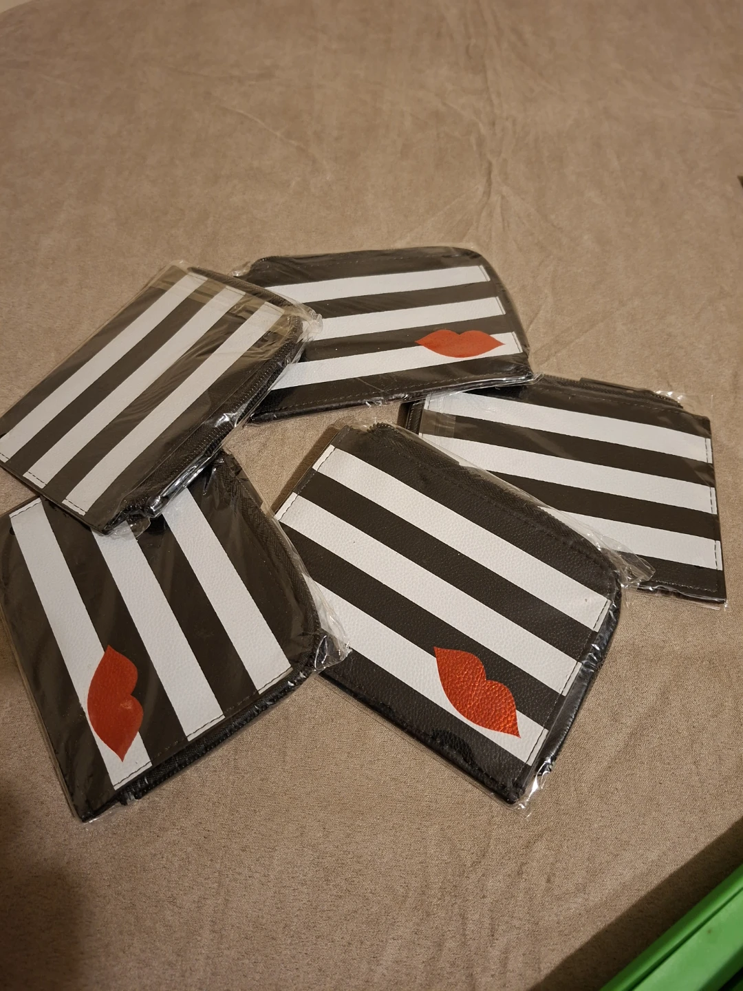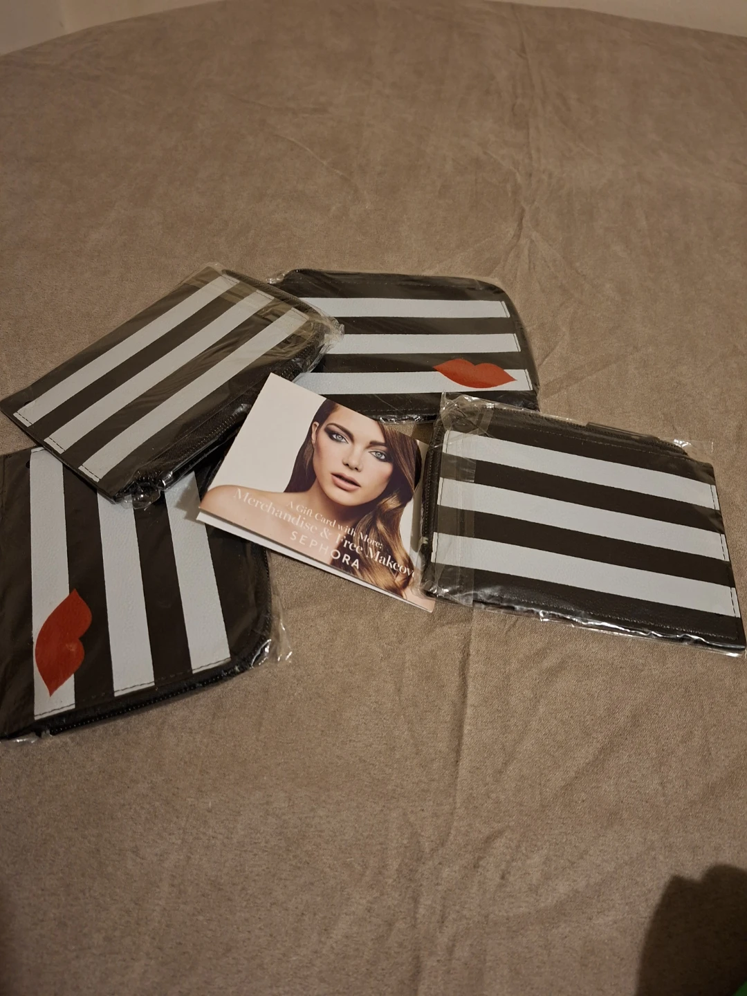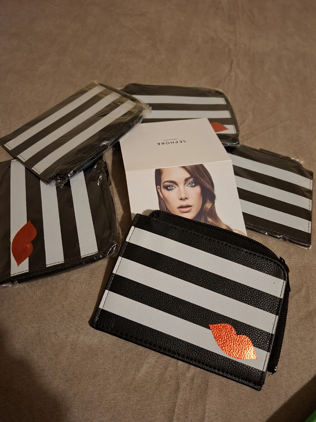 Get organised with this set of five Sephora makeup pouches! They feature a classic black and white stripe design with a cute red lip accent. Perfect for storing your makeup, toiletries, or other small essentials on the go.