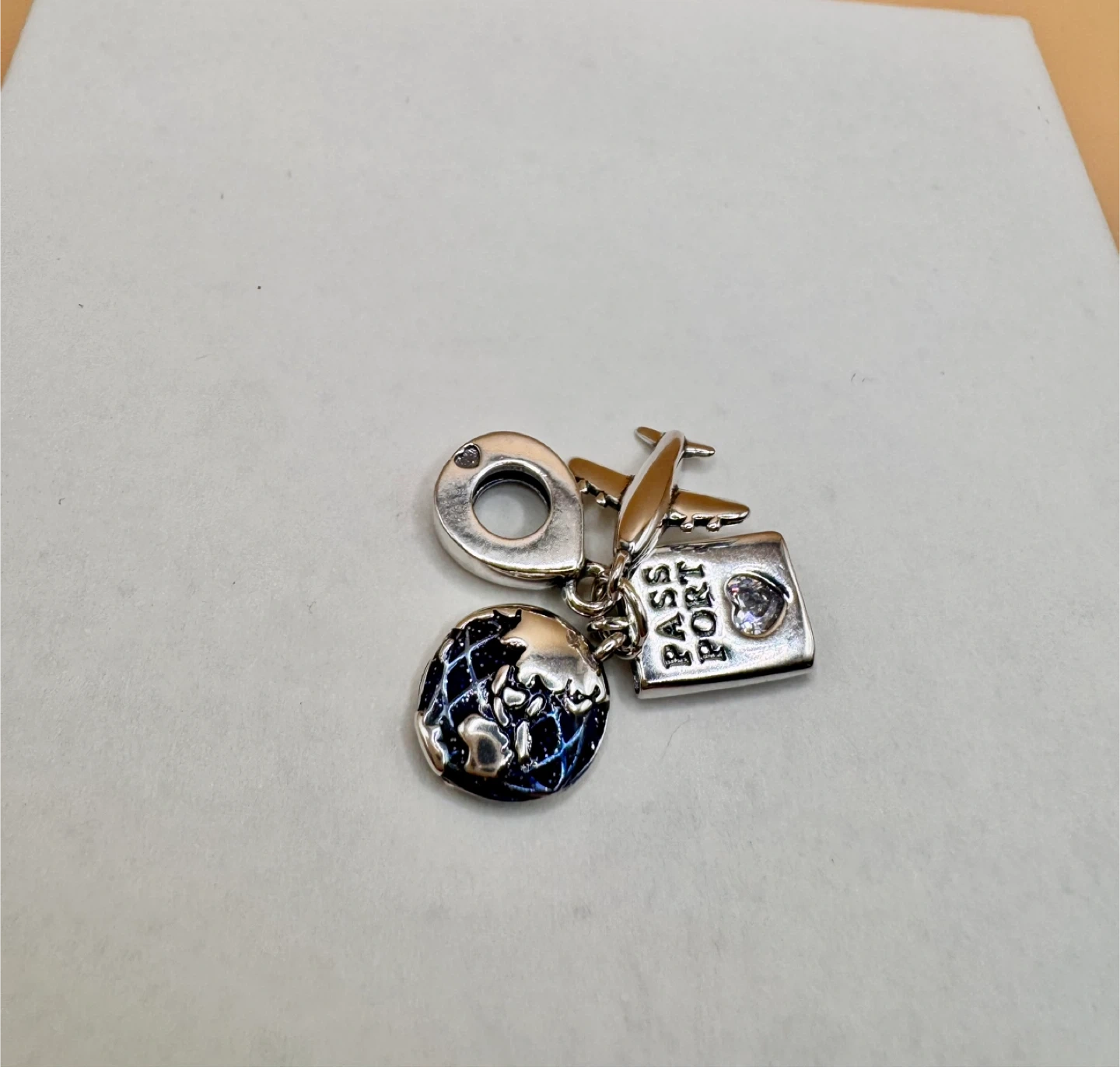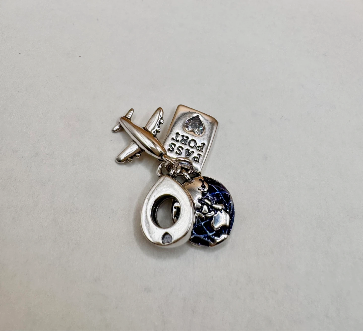 Sterling silver 925 travel charm featuring an airplane, a globe, and a passport with "PASS PORT" engraving. Includes a sparkling accent on the passport. Adds a touch of wanderlust to your bracelet!