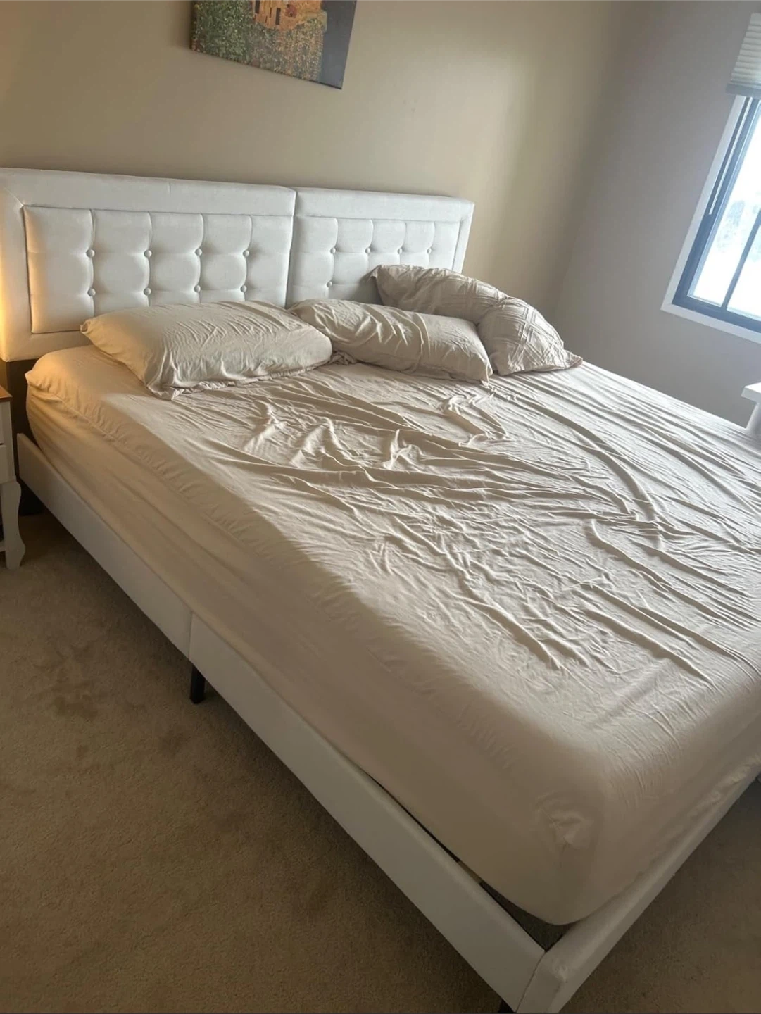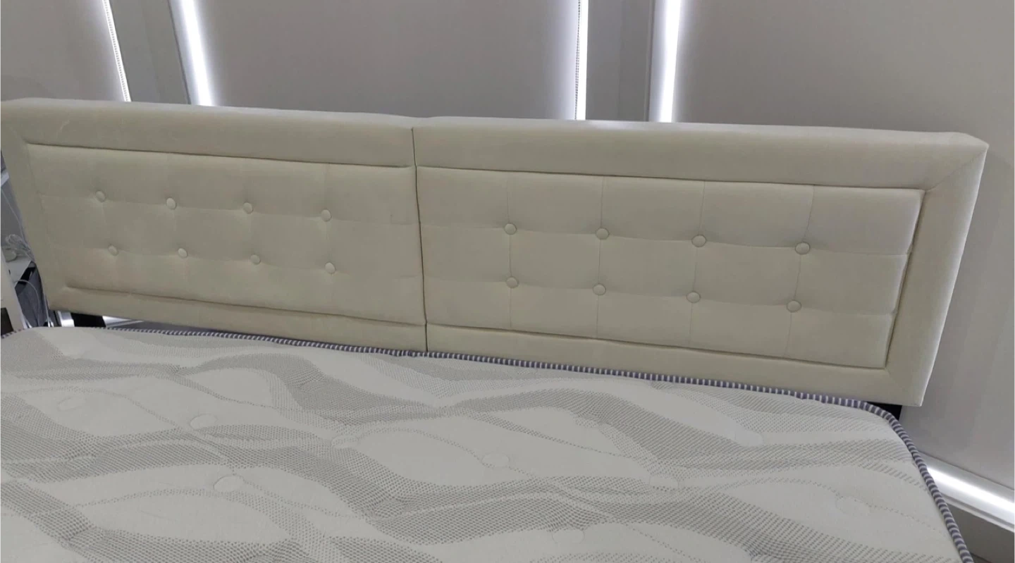 Selling a qjeen-size bed frame with a stylish white upholstered headboard. It’s in great condition and would look lovely in any bedroom. The headboard features button detailing for a touch of elegance. Perfect for adding a bit of comfort and style to your space!