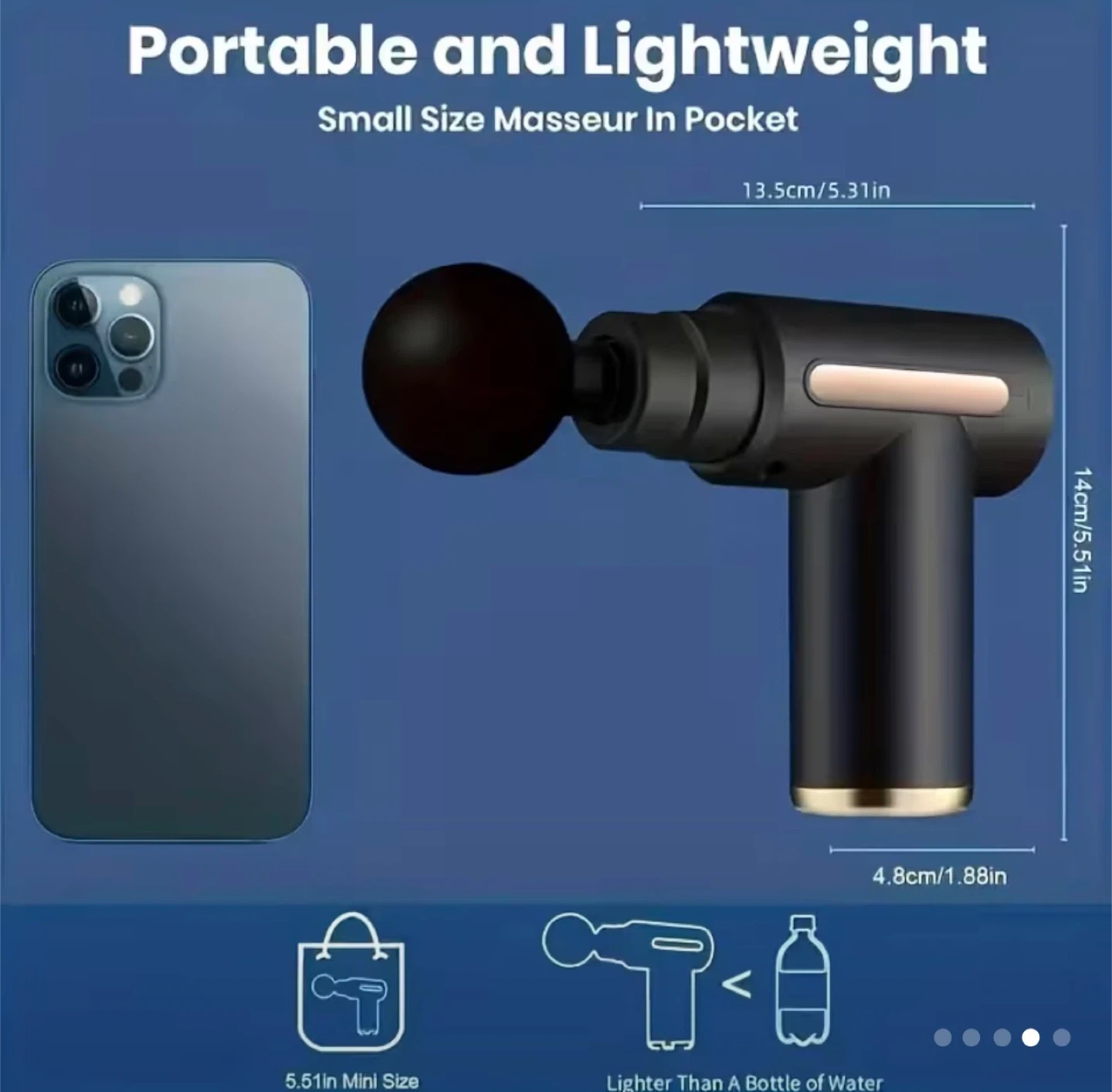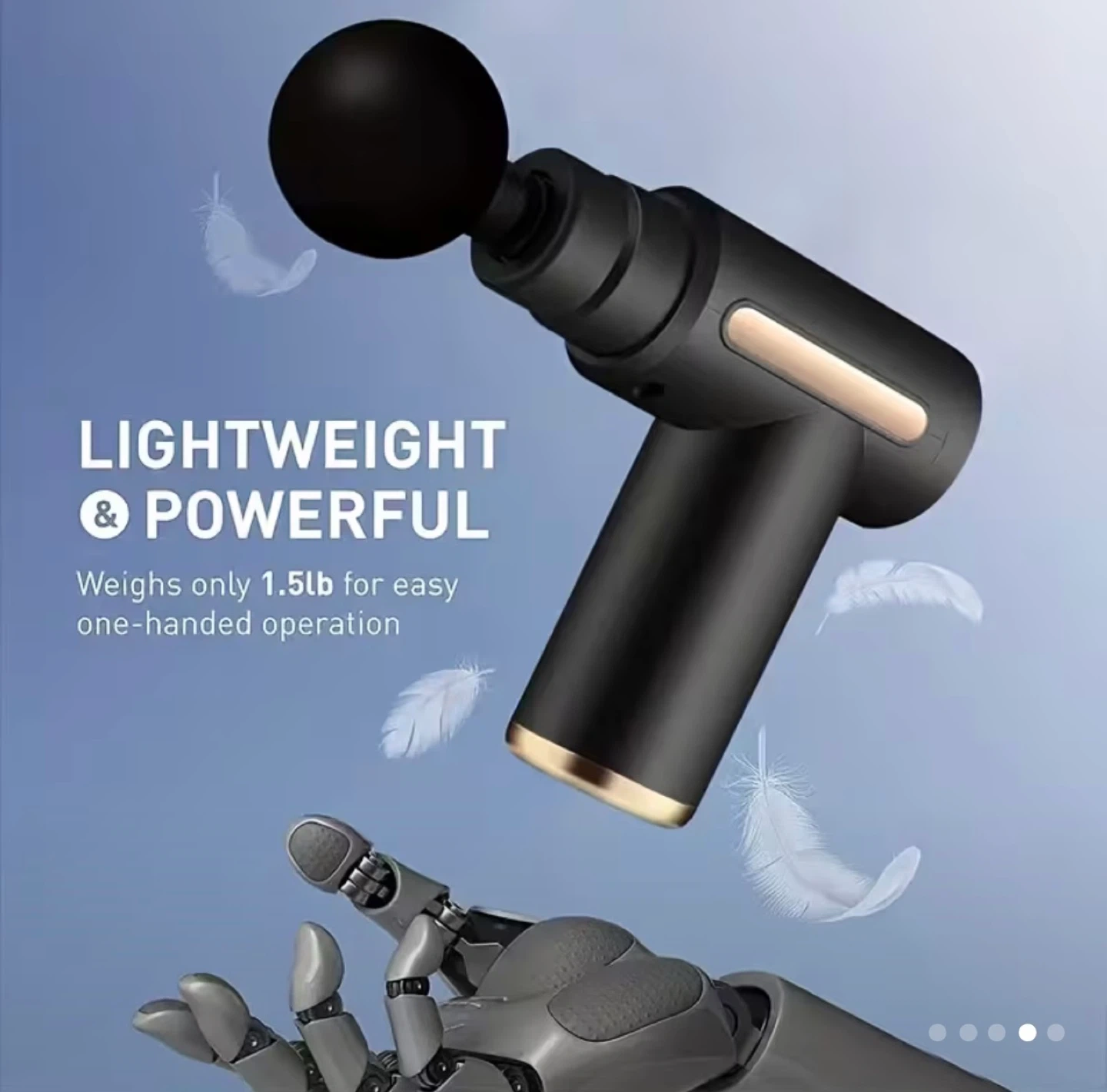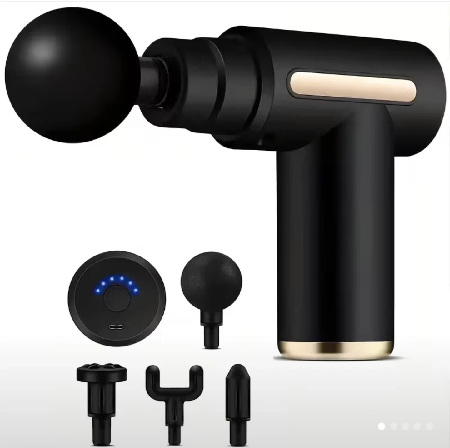 This black massage gun is portable and lightweight, weighing only 1.5 lbs. It features 6 speed levels for customized relief. Comes with multiple massage heads for different areas. Type-C charging port included.
