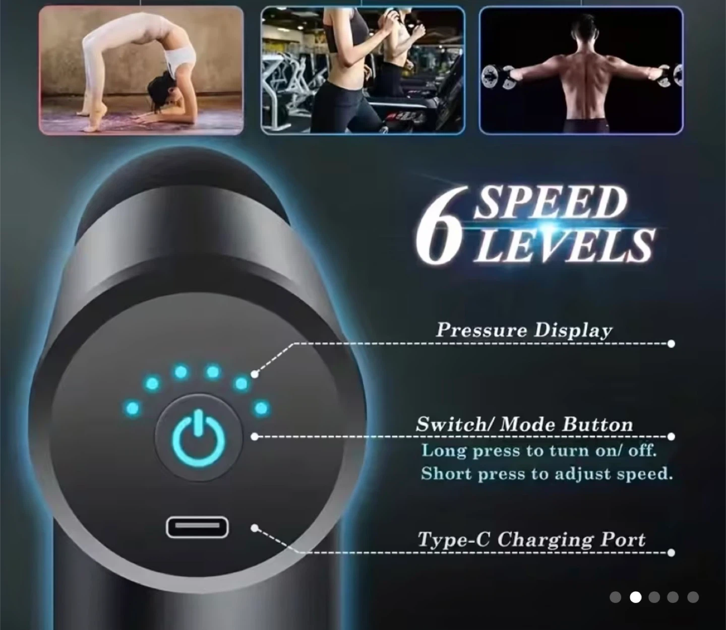 This black massage gun is portable and lightweight, weighing only 1.5 lbs. It features 6 speed levels for customized relief. Comes with multiple massage heads for different areas. Type-C charging port included.